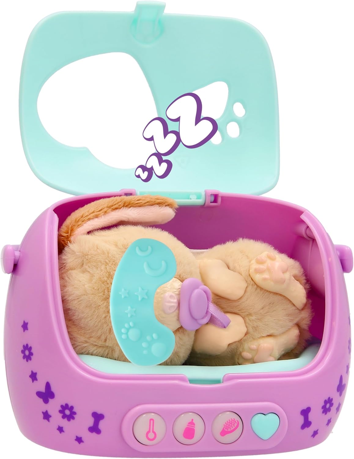 Cucciolo con molti accessori e un trasportino elettronico per giocare alla cura. Premi il pulsante a forma di cuore per vedere il bisogno del pet e scegli l’accessorio giusto per nutrirlo, calmarlo o pettinarlo. Include biberon, siringa, spazzola, ciuccio e altri accessori per un’esperienza di cura completa e coinvolgente. Tieni premuto il pulsante per attivare la modalità nanna, metti la mascherina al pet e riponilo nel trasportino per un momento di riposino tranquillo. Scegli tra coniglietto, cagnolino o gattina e porta il tuo cucciolo ovunque grazie alla maniglia del trasportino.