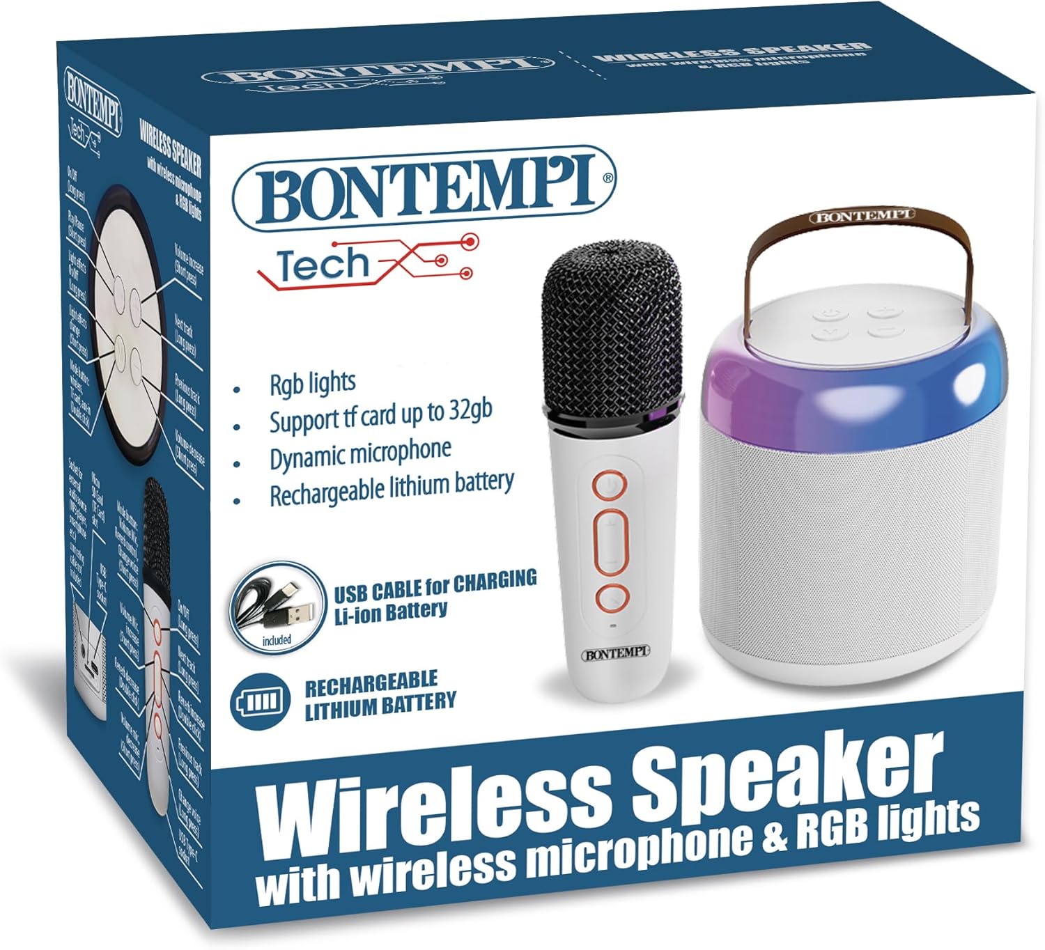 Cassa acustica wireless con microfono senza filo e luci RGB integrate. Permette di ascoltare musica e audio da micro SD card (non fornita), smartphone, tablet, PC o laptop tramite connessione wireless. Include regolazione dell’effetto eco, volume microfono, volume brano, effetti luminosi attivabili, effetto cambiavoce e tasti per selezione brano precedente e successivo. Dotata di slot per micro SD card (TF) e presa USB tipo-C per ricarica della batteria al litio con cavetto incluso. Ideale per performance vocali e ascolto musicale dinamico.