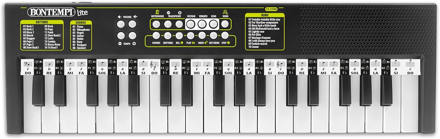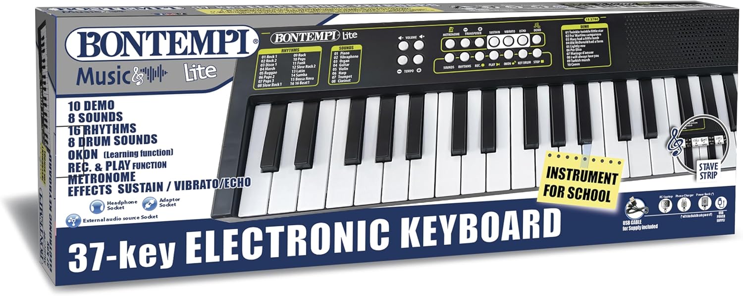 Scopri la tastiera elettronica a 37 tasti, lo strumento perfetto per introdurre bambini e principianti al mondo della musica. Compatta, leggera e ricca di funzioni, offre un’esperienza musicale completa e divertente. Con 10 canzoni preregistrate, 8 suoni strumentali, 16 ritmi e 8 percussioni sulla tastiera, stimola la creatività e aiuta a sviluppare il senso del ritmo e dell’armonia. La funzione OKON facilita l’apprendimento, permettendo di suonare anche senza esperienza, mentre la registrazione e il riascolto permettono di seguire i progressi nel tempo. Gli effetti speciali come Eco, Sustain e Vibrato, insieme alla funzione Transposer e alla regolazione di volume e tempo, permettono di personalizzare ogni performance. Può essere alimentata tramite USB-C (cavo incluso) o con 4 batterie AA (non incluse), rendendola perfetta anche per l’uso portatile. Inoltre, è presente una presa cuffie per suonare senza disturbare. Dimensioni compatte (480x150x40 mm) e design funzionale la rendono ideale per la casa, la scuola o i viaggi. Un regalo perfetto per iniziare a suonare con entusiasmo e semplicità!