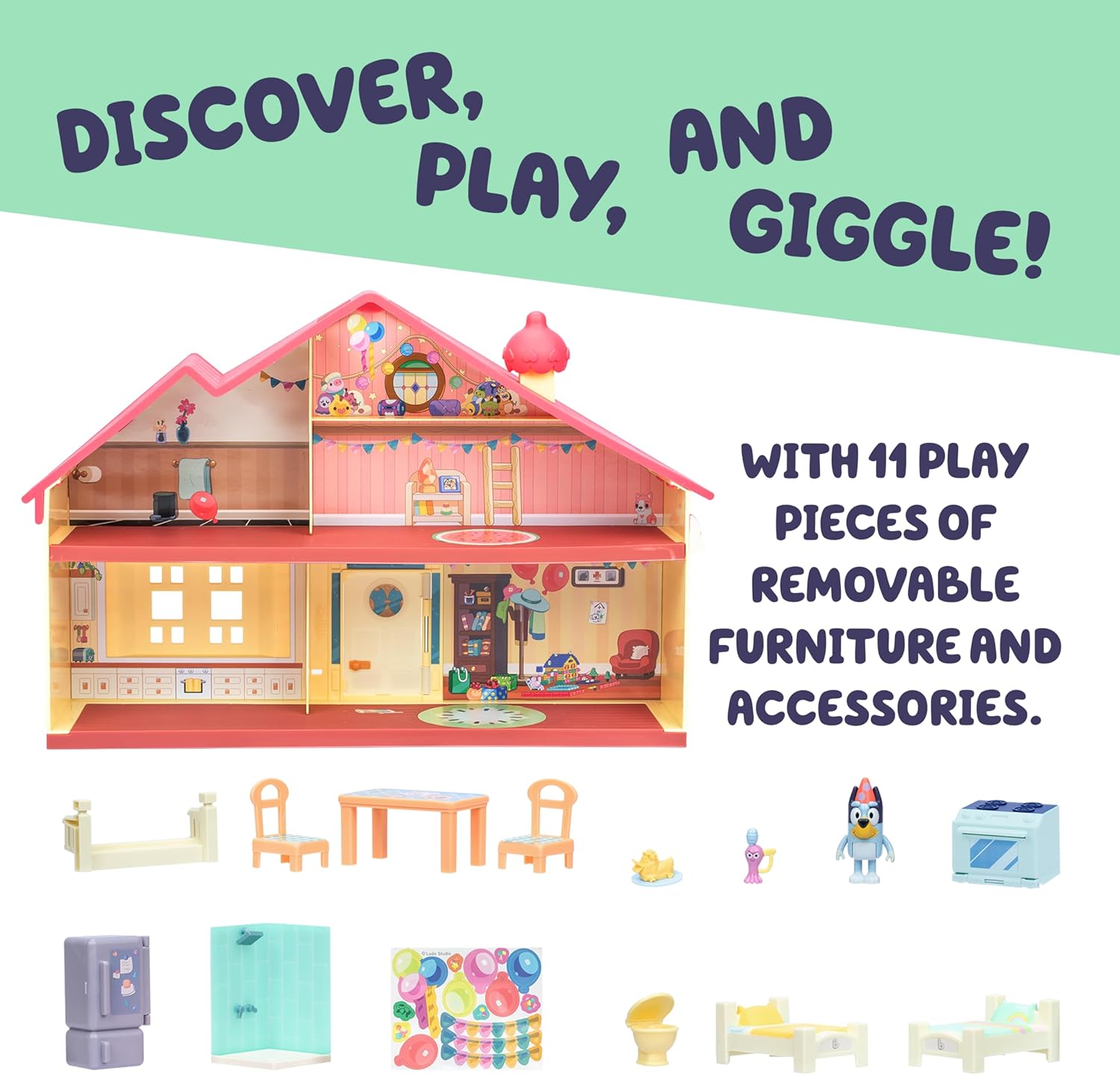 C’è un party a casa Heeler e sei invitato! Con quattro stanze diverse e due livelli, nella Celebration Home di Bluey c’è spazio per far divertire Bluey e i suoi amici! La camera da letto è perfetta per un pigiama party! Il playset è dotato di 11 accessori, tra cui due letti, un tavolo da pranzo con sedie, un frigorifero e un forno con la torta d’anatra! Usa il foglio di adesivi per decorare la casa prima dell’arrivo degli ospiti. Inclusa, troverai un’esclusiva action figure di Bluey da 6 cm che indossa un cappello da festa! La Celebration Home è dotata anche di una comoda maniglia per il trasporto, così da poter portare la festa in giro.