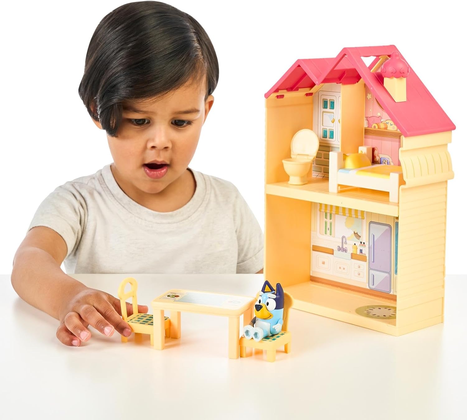 - Con 3 stanze e molti mobili rimovibili, puoi rivivere le avventure di Bluey, grazie alla action figure da 6 cm inclusa, aiutandola a fare un pisolino, a fare uno spuntino in cucina e persino ad andare in bagno.