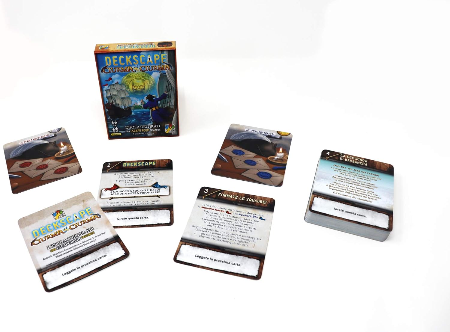 Deckscape – Ciurma VS Ciurma è la prima Escape Room da tavolo competitiva al mondo: risolvi gli enigmi prima della squadra avversaria per assicurarti la vittoria! Deckscape è una linea di giochi di carte che ricrea sul tuo tavolo l’esperienza delle vere Escape Room. Risolvi enigmi, giochi di logica e sfide di ogni tipo, trova e utilizza oggetti e scopri i retroscena della trama, insieme alla tua squadra. In questo titolo della serie Deckscape vestirete i panni di veri bucanieri, alla ricerca di un ricco bottino! Nessun regolamento da imparare: apri la scatola e inizi subito a giocare! Con Deckscape non rimani mai bloccato: se non riesci a risolvere un enigma, volta la carta e leggi la soluzione! Terminata la sfida, rimetti le carte in ordine numerico e il gioco è pronto per i prossimi giocatori. Grazie a una narrazione immersiva e ai numerosi e originali enigmi, i giochi della linea Deckscape sono perfetti per le serate in famiglia o tra amici!