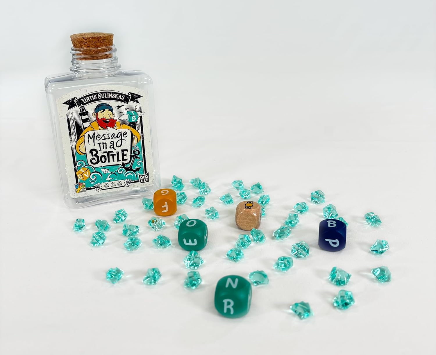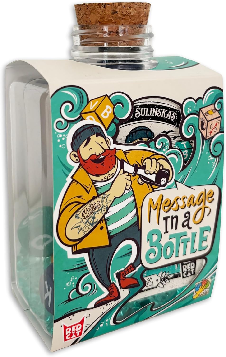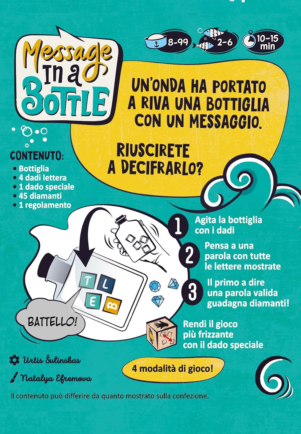 Message in a Bottle è un gioco di parole spumeggiante… in bottiglia! Agita i dadi-lettera all’interno della bottiglia trasparente e trova una parola di almeno 4 lettere che usi tutte quelle mostrate sulla faccia visibile dei dadi. Il primo che la dice ad alta voce, vince il round e ottiene un diamante; se invece sbaglia, perde un diamante. Pensi che non ci siano parole che contengono tutte le lettere? Puoi dire “nessuna parola” e contare fino a 10. Se avevi ragione, guadagni un diamante! Scopri tutte le varianti di gioco: quella semplificata, adatta ai bambini, quella avanzata, per i giocatori più “navigati”, e quella party per chi vuole una modalità di gioco più movimentata. Si spiega in tre parole: il regolamento è facile…come bere un bicchier d’acqua!