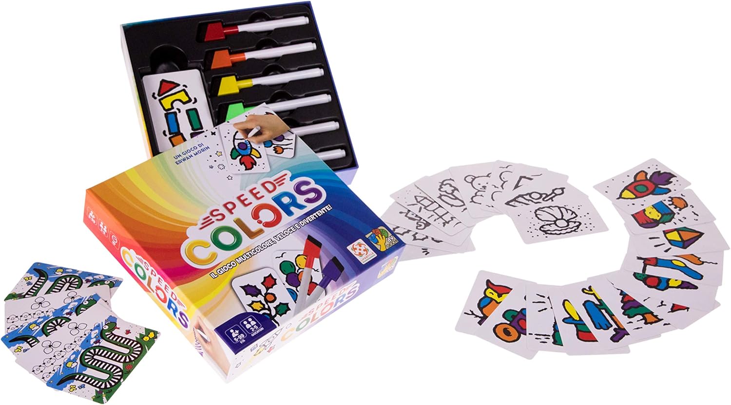 Il gioco di carte multicolore che mette alla prova i “piccoli pittori”. Giocare a Speed Colors è semplicissimo. Ogni giocatore dovrà memorizzare i colori dell’immagine rappresentata sulla sua carta, e poi voltarla sul lato bianco e nero e colorare entro i bordi dell’illustrazione, utilizzando i pennarelli giusti. I giocatori più rapidi e precisi ottengono punti preziosi. Per i giocatori esperti, dal secondo round le cose si fanno più difficili: il giocatore con meno caselle colorate sulla sua carta segnapunti, sceglie due pennarelli e ne scambia i cappucci. Per prendere il colore giusto bisognerà aguzzare la memoria. Un gioco veloce, divertente e… coloratissimo! Hai esaurito i pennarelli? Vuoi nuove carte da colorare? C’è il set di Carte e pennarelli extra!
