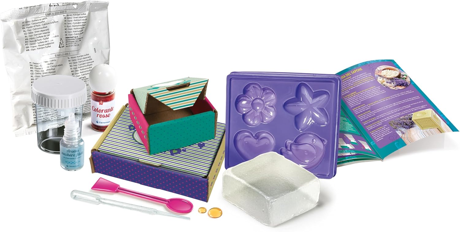 - CONTENUTO DEL GIOCO: sapone per la preparazione di cosmetici, ingredienti cosmetici, colorante, strumenti da laboratorio, stampino in diverse forme per saponette, cofanetti regalo e manuale scientifico illustrato