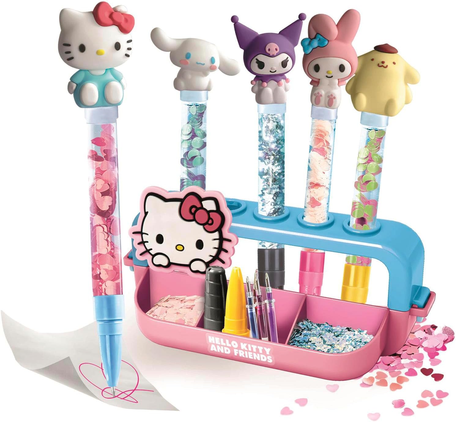 - COSA CONTIENE: gioco per bambine da 6 anni in su, con base e imbuto, 5 penne personalizzabili, tappi colorati, 5 ricariche di inchiostri, 5 bustine di decorazioni scintillanti, 5 personaggi in gomma, adesivi a tema Hello Kitty e manuale illustrato