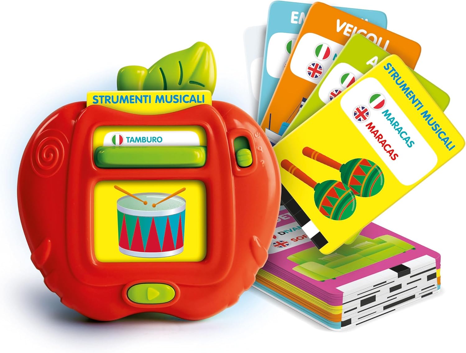 Divertente console parlante interattiva, leggera e trasportabile, per aiutare i bambini a sviluppare il linguaggio e ampliare il vocabolario.50 carte illustrare fronte retro per imparare le prime parole in Italiano e inglese. Due modalità di gioco: Esplora, con parole, suoni e filastrocche; e Quiz per facilitare l’apprendimento. Inserisci la carta, premi il bottone e ascolta il nome e il suono dell’immagine raffigurata.6 diverse categorie: Animali, Veicoli, Strumenti Musicali, Oggetti/Alfabeto, Emozioni e Colori. Un gioco bilingue, ideale per l’apprendimento.
