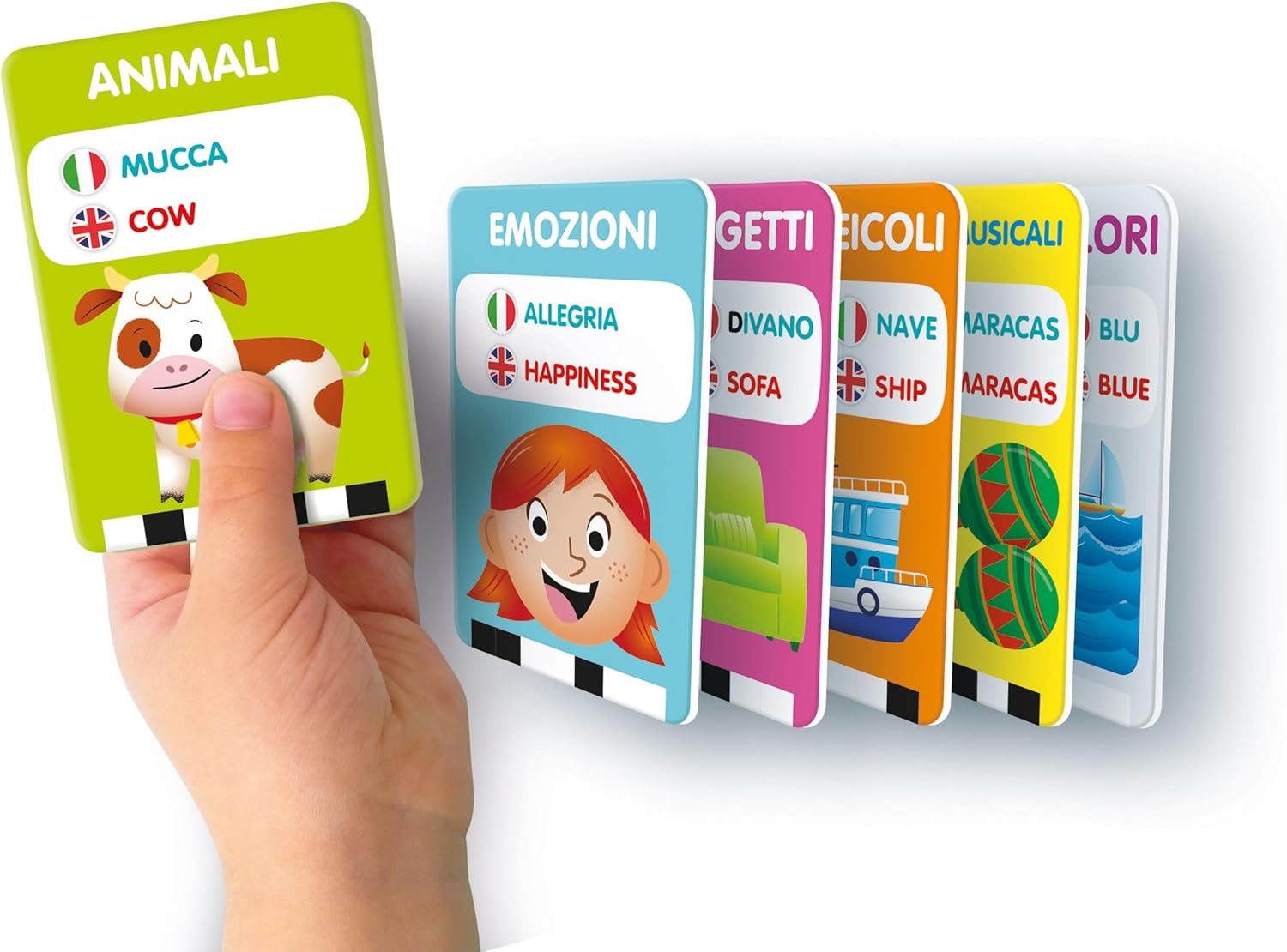 • COSA CONTIENE: gioco educativo ideato, progettato e sviluppato in Italia, adatto per bambini dai 2 ai 4 anni, include 50 flashcards fronte-retro in italiano e inglese e una console interattiva; batterie incluse per un gioco immediato e senza interruzioni