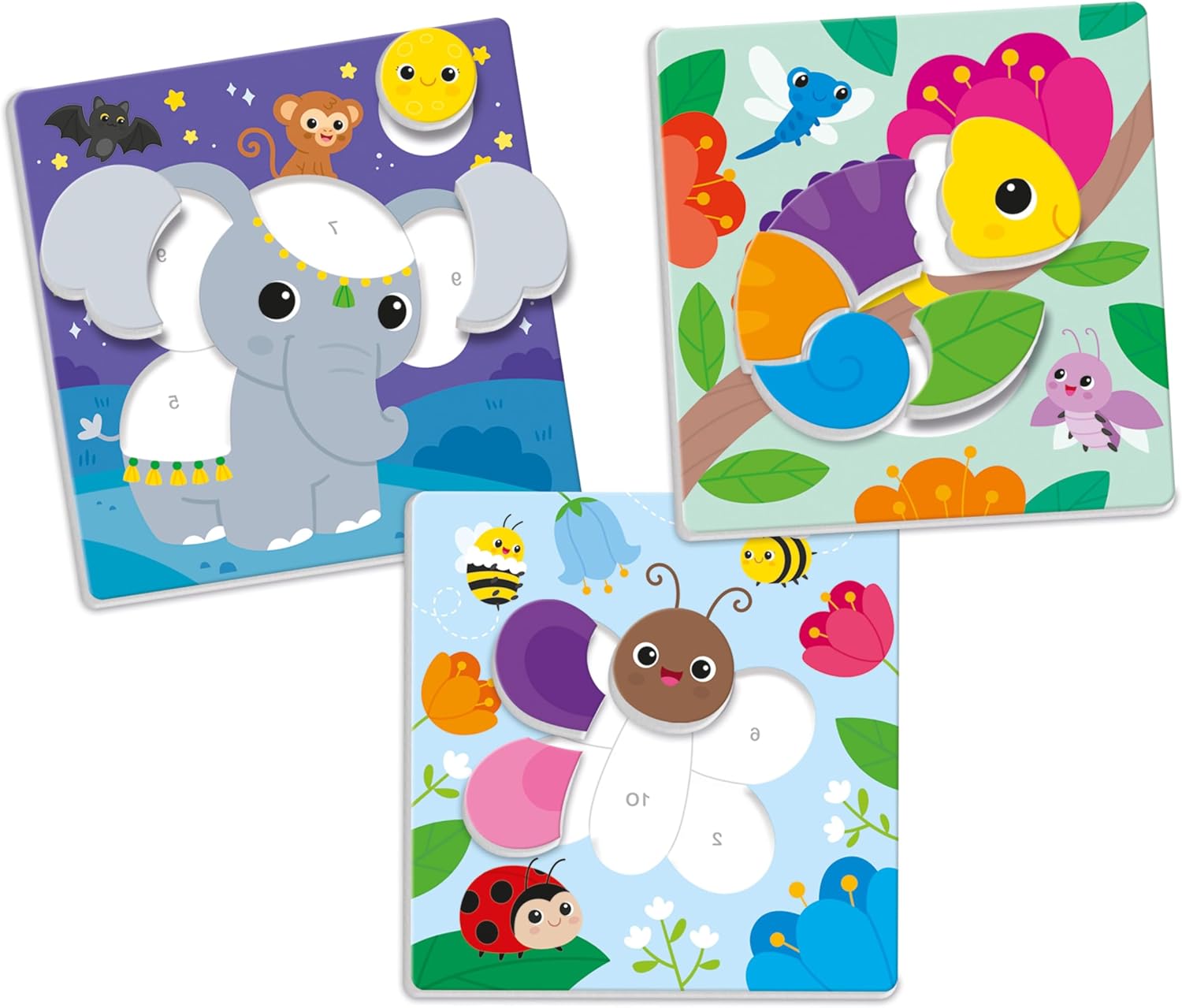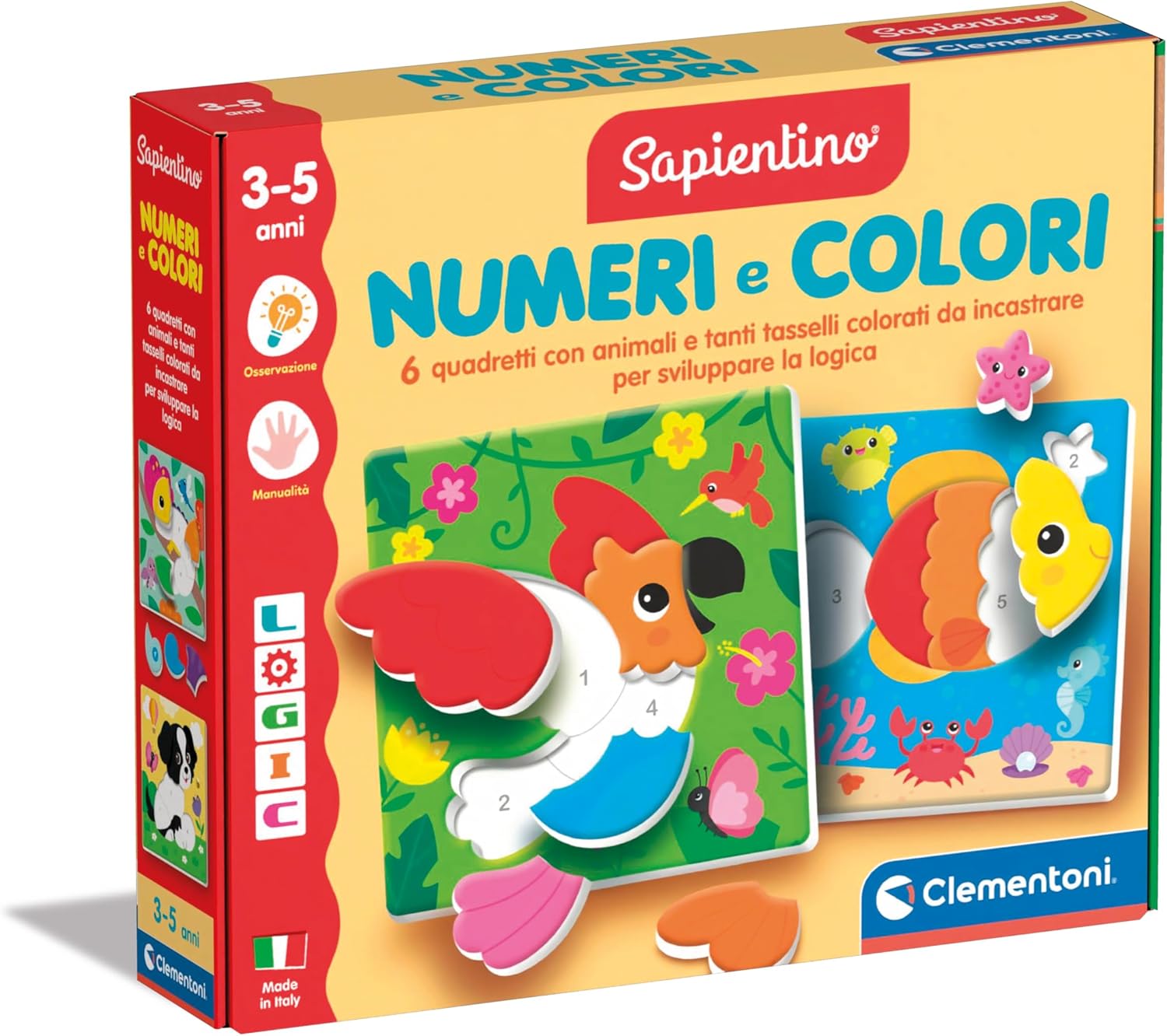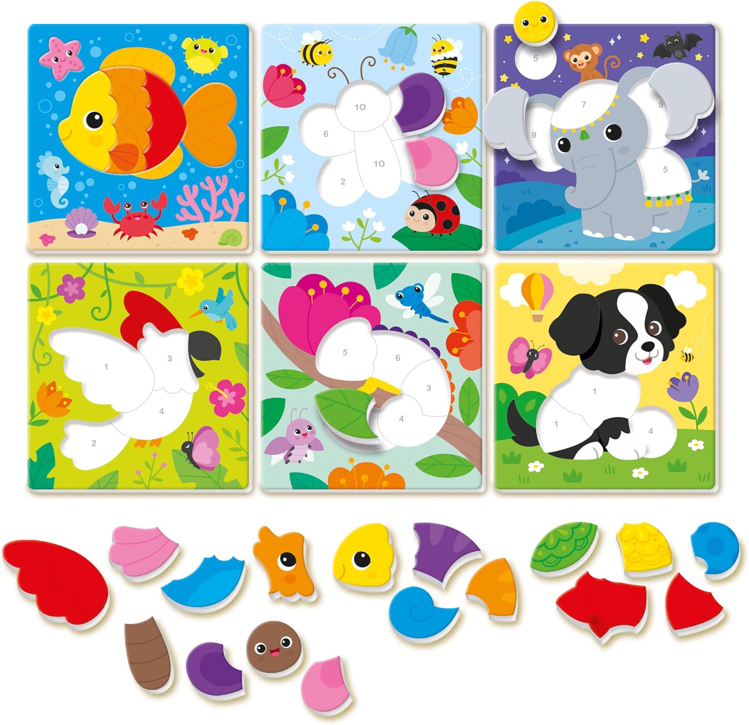 Un kit educativo completo per introdurre i bambini al mondo delle cifre e delle tonalità di colore, attraverso il pensiero logico, con puzzle a incastro da ricostruire e completare. Un gioco educativo che stimola lo sviluppo linguistico e la capacità di riconoscere e associare numeri e colori grazie a tessere sagomate che rendono l’apprendimento divertente e coinvolgente. Attraverso la guida dei numeri i bambini compongono le immagini ricostruendole come puzzle e imparano a riconoscere colori e cifre. Gioco educativo Made in Italy, adatto per bambini dai 3 ai 5 anni; include 6 quadretti di animali da ricomporre, 4 tessere di cartone con 29 tasselli e una guida con i suggerimenti di gioco.