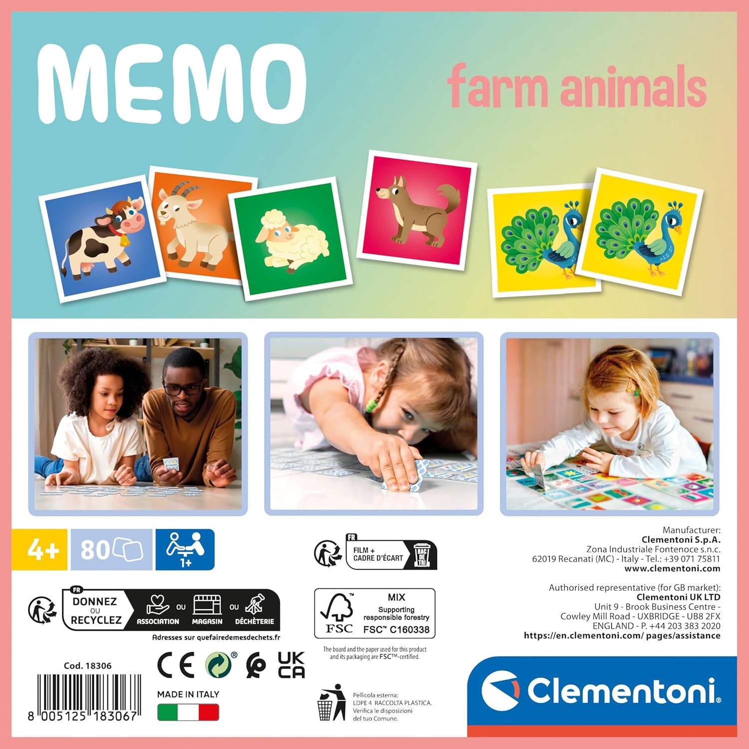 Un gioco classico ma sempre attuale per sviluppare capacità di osservazione e memoria. 80 tessere illustrate 6 x 6 cm, resistenti e colorate. Grazie alle bellissime immagini colorate sarà ancora più divertente sfidare i propri amici al gioco di memoria più famoso di sempre. Il vincitore è il giocatore che abbina il maggior numero di tessere. Divertiti con gli animali che puoi trovare nella fattoria! Un gioco educativo adatto all’età prescolare, consigliato per i bambini a partire dai 3 anni. Made in Italy.