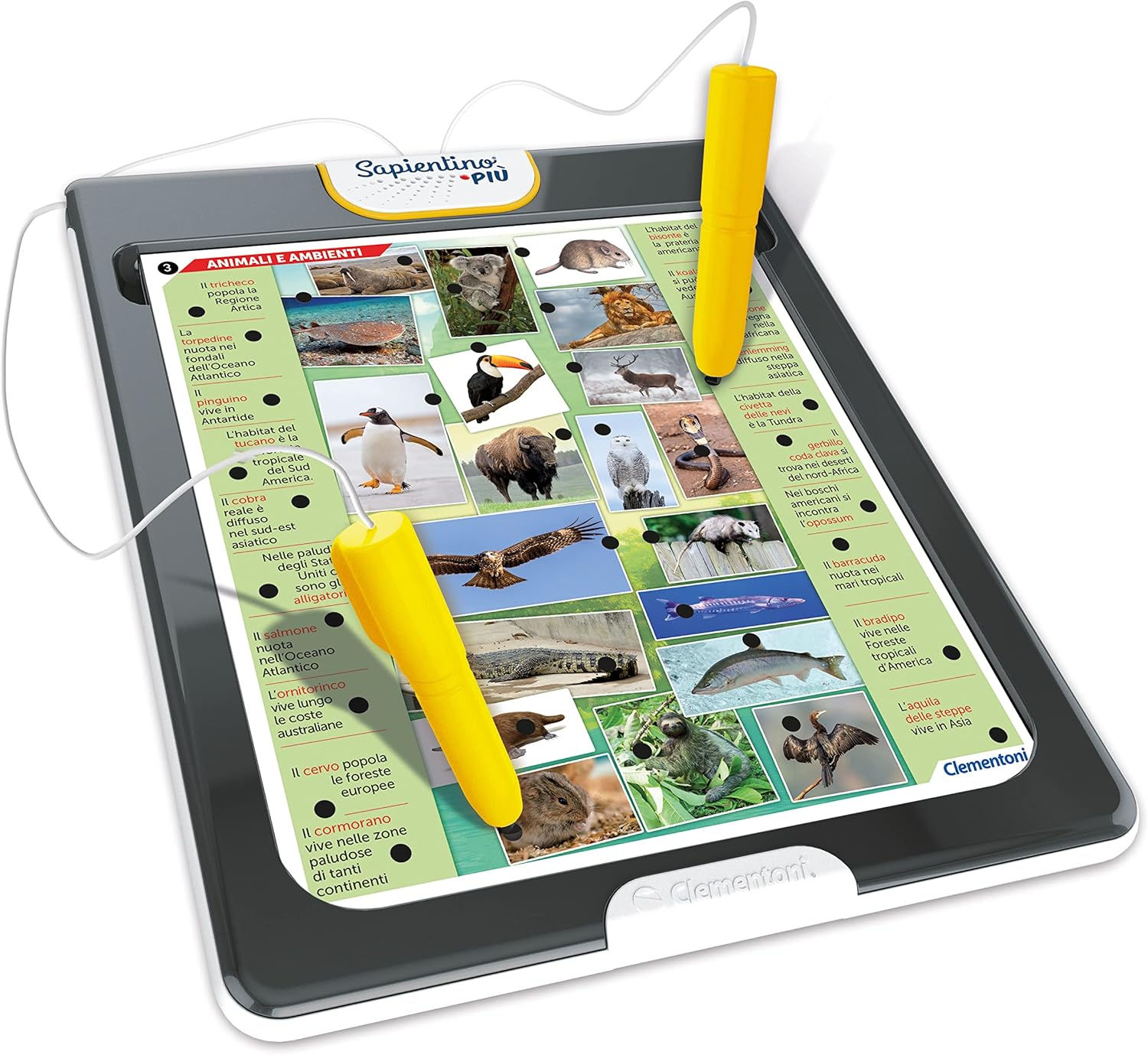 Un gioco educativo con penne parlanti con oltre 500 domande su animali, corpo umano, dinosauri, storia e scienze e un’app dedicata con tanti quiz e contenuti da scoprire. Con più di 500 domande e attività interattive, i bambini possono esplorare molti argomenti come scienze, storia, astronomia e molto altro, sviluppando la loro conoscenza e le capacità di associazione e memorizzazione in modo divertente. I bambini usano le penne parlanti per rispondere ai quiz sulle schede illustrate associando domande e risposte; le attività rendono l’apprendimento intuitivo e coinvolgente, mentre l’app offre quiz extra e contenuti interattivi da esplorare. Gioco educativo Sapientino Made in Italy; adatto per bambini dai 7 anni in su, include grandi schede illustrate con oltre 500 domande su animali, corpo umano, dinosauri e altro, e spinotti interattivi, con suoni e luci. Divertenti giochi educativi su animali, parole, numeri, colori e emozioni, per stimolare e supportare il bambino durante la crescita, offrendo strumenti per un apprendimento efficace e interattivo in ogni fase dello sviluppo.
