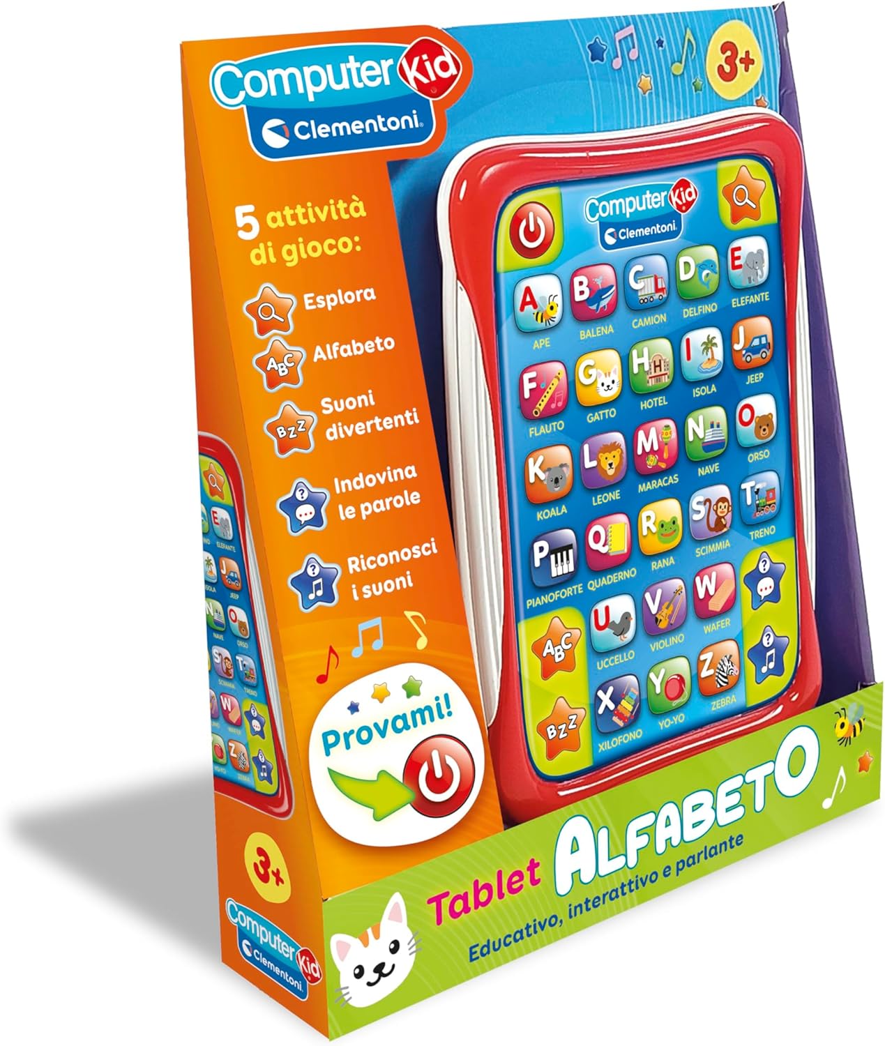 Un tablet educativo interattivo progettato per insegnare ai bambini da 3 a 6 anni le lettere dell’alfabeto, i suoni e le prime parole in modo giocoso e coinvolgente. Con 30 punti di contatto associati ad altrettante immagini, il bambino impara a riconoscere le lettere e ad associare ogni fonema a un oggetto o animale. Grazie alle 5 modalità di gioco, il tablet offre un percorso completo: riconoscimento delle lettere, pronuncia, parole, quiz e suoni. Pensato per promuovere l’apprendimento autonomo, il tablet stimola memoria uditiva, linguaggio e concentrazione attraverso il gioco attivo. Fa parte della linea Sapientino: un gioco educativo dal design accattivante, con packaging try-me per provare subito l’esperienza sonora. Ideato, progettato e sviluppato in Italia.