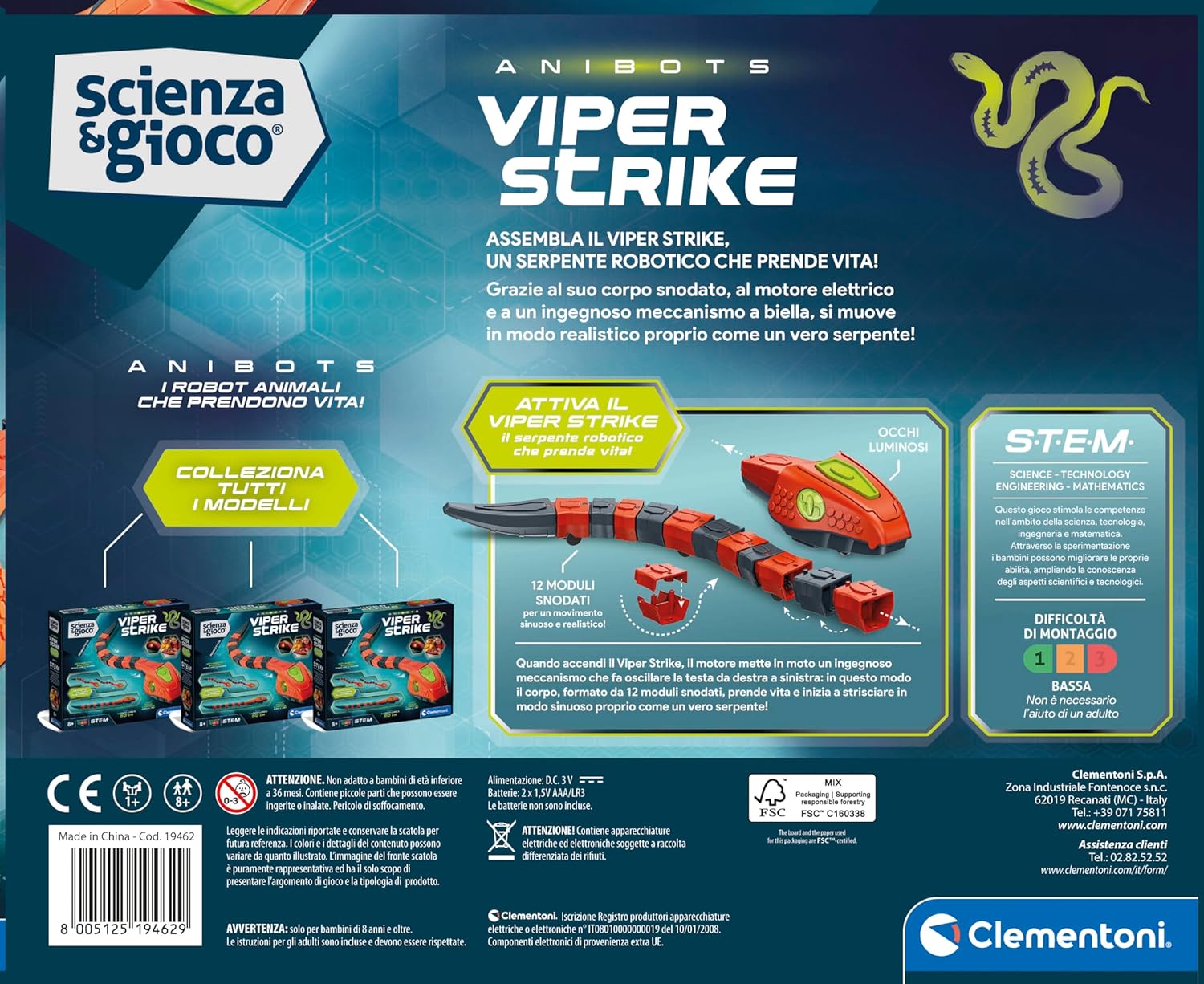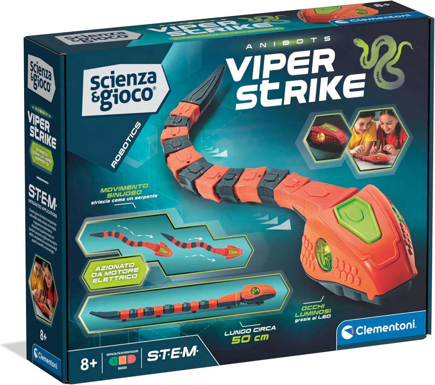 - VIPER STRIKE: un kit per assemblare un robot che si muove come un vero serpente; composto da 12 moduli snodati facili da assemblare, include un motore elettrico collegato a una biella per strisciare in modo sinuoso e realistico quasi come se fosse vivo