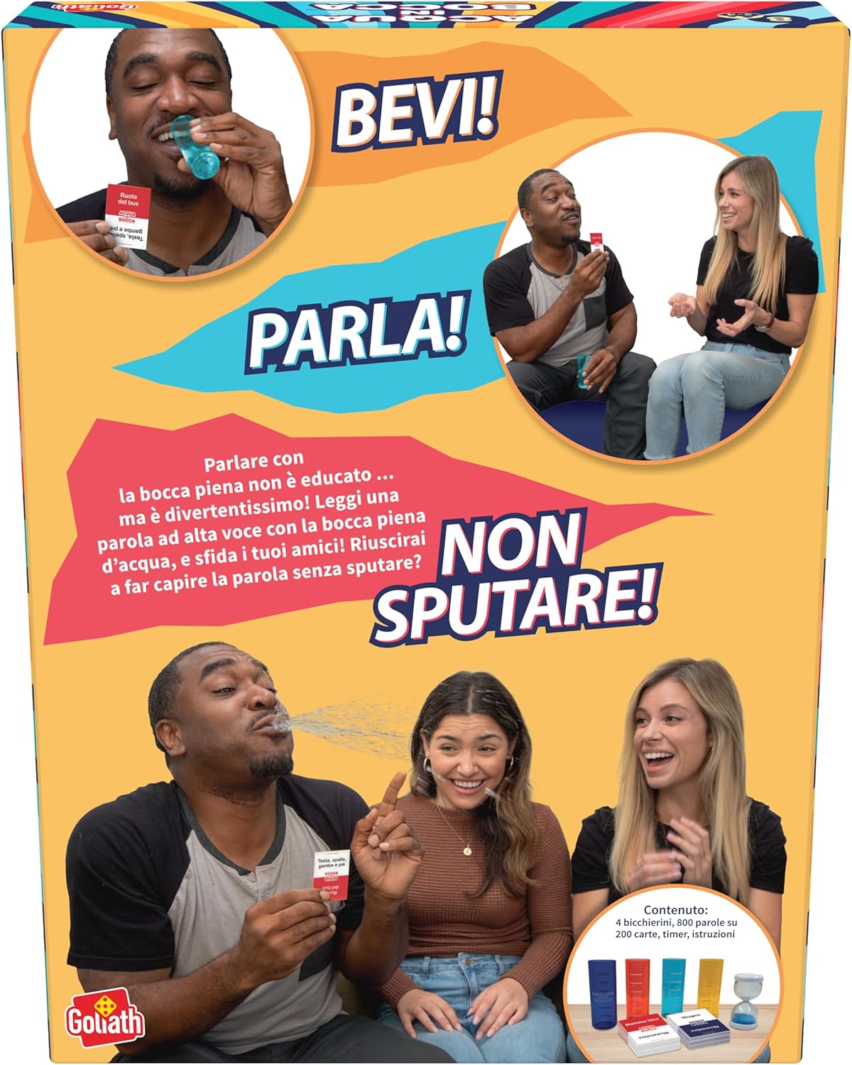 Con ACQUA IN BOCCA, cerca di far indovinare parole o frasi tenendo l’acqua in bocca… senza schizzare tutti! Un party game originale che garantisce risate a non finire con amici e familiari di ogni età. Il concetto è semplice ma spassosissimo: riempi la bocca d’acqua, leggi una carta e prova a farla indovinare… senza sputare! Un gioco che mette alla prova il controllo, la dizione e la capacità di far ridere gli altri. Perfetto per bambini, ragazzi e genitori, questo gioco è adatto a partire da 8 anni e si gioca da 2 a 4 partecipanti. Le regole sono semplici, l’interazione alta e l’allegria contagiosa. Ideale per momenti condivisi. La scatola contiene 200 carte (con oltre 800 parole/frasi), 4 bicchieri, 1 clessidra e le istruzioni. Facile da trasportare e rapido da preparare: gioca a casa, in viaggio o alle feste con gli amici. ACQUA IN BOCCA è completamente in italiano, per rendere ogni partita più fluida e divertente. Niente barriere linguistiche: solo tanto divertimento per tutta la famiglia o per un gruppo di amici pronti a ridere insieme.
