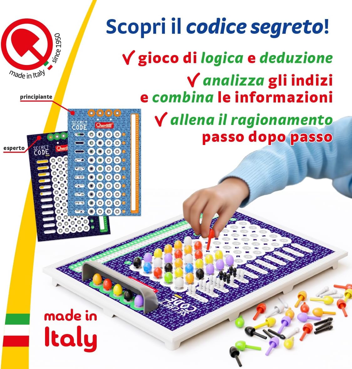 • QUALITÀ QUERCETTI, DIVERTIMENTO 100% MADE IN ITALY – Da oltre 70 anni, Quercetti crea giochi educativi sicuri e intelligenti come i chiodini per bambini. Codice Segreto è tra i giochi da tavolo bambini più apprezzati, un bestseller che unisce apprendimento e divertimento per tutti.