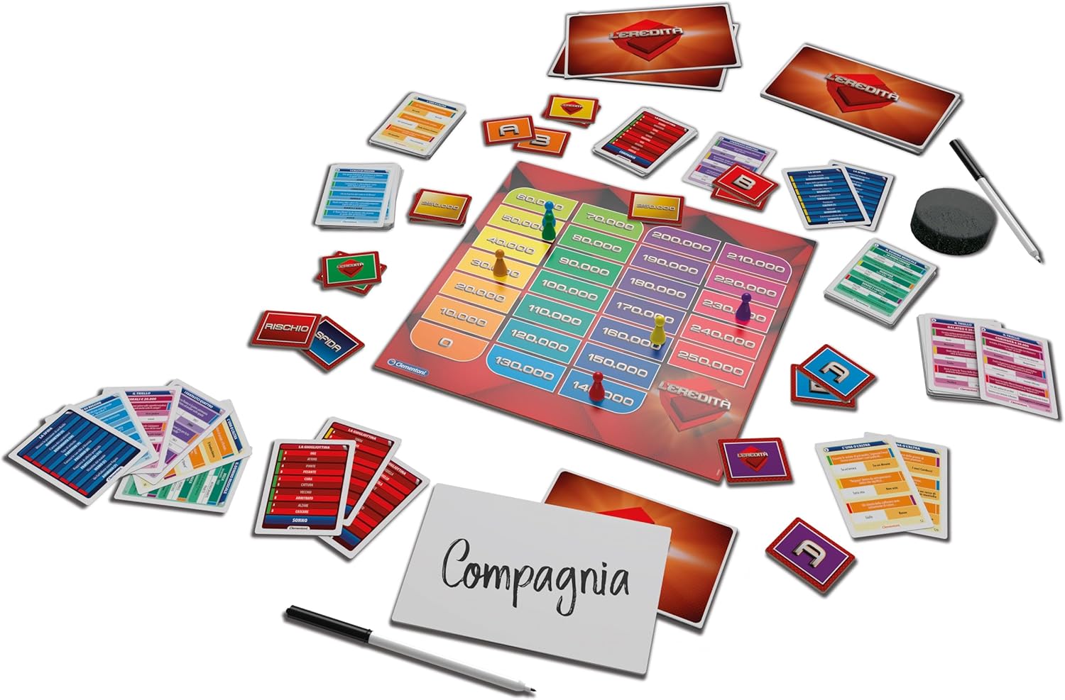 GIOCO DA TAVOLO UFFICIALE EREDITA’: il famoso quiz televisivo con la ghigliottina nella versione gioco da tavolo ufficiale firmato Clementoni! Rivivete in casa le emozioni del quiz RAI più popolare!