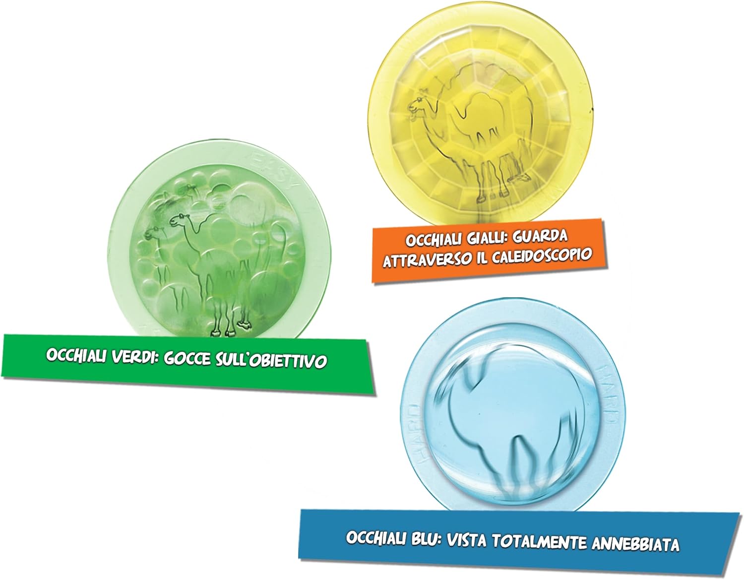 La confezione contiene: 1 paio di occhiali, 3 lenti con distorsione ottica (facile, medio, difficile), tabellone , 4 figure, blocco da disegno, 1 matita, cubo, timer, 54 carte da gioco (corrispondenti a 162 soggetti)