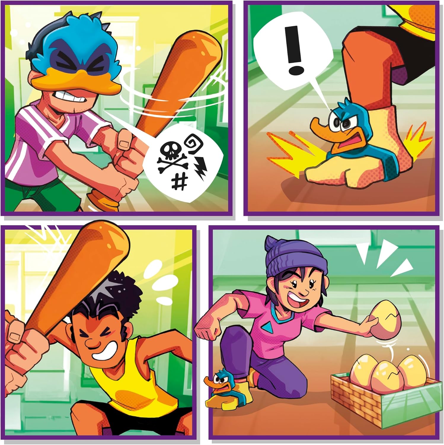 In questo gioco dinamico, un giocatore deve proteggere le uova con una maschera e una mazza gonfiabile per custodirle. Nel frattempo, gli altri giocatori, con zampe da papera rumorose, cercano di rubarle senza farsi prendere. La sfida è schivare la mazza in movimento e afferrare le uova.