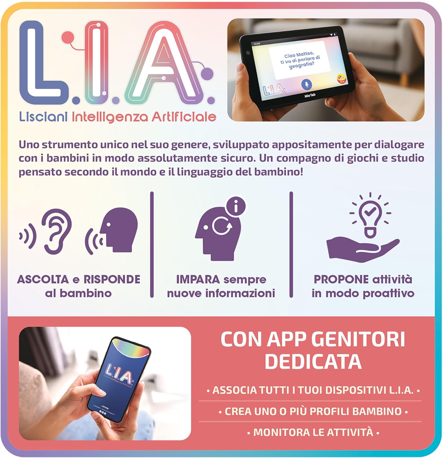 Il nuovo Mio Tab integrato con L.I.A.! Uno strumento completamente a misura di bambino per guidarlo nel mondo dell’intelligenza artificiale. Un amico per tutte le necessità del tuo bambino, dal gioco alle sue mille curiosità. Un valido sostegno anche per lo studio e l’apprendimento smart!ù