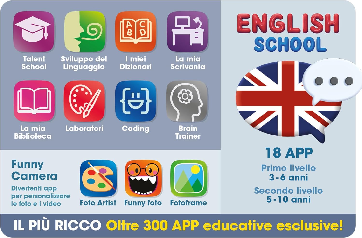 Con intelligenza artificiale. Schermo da 7 pollici – Memoria Flash 32 GB – Ram 4 GB – Wi-Fi – Bluetooth – Google Play Store – Internet sicuro – Bumper protettivo con stender – Integrato con App d’Intelligenza Artificiale. Tablet – Cavo USB type-C – Caricatore – Manuale istruzioni. Autonomia – Capacità sensoriali – Coordinazione occhio mano – Lessico – Attenzione e concentrazione – Apprendimento – Sviluppo del linguaggio.