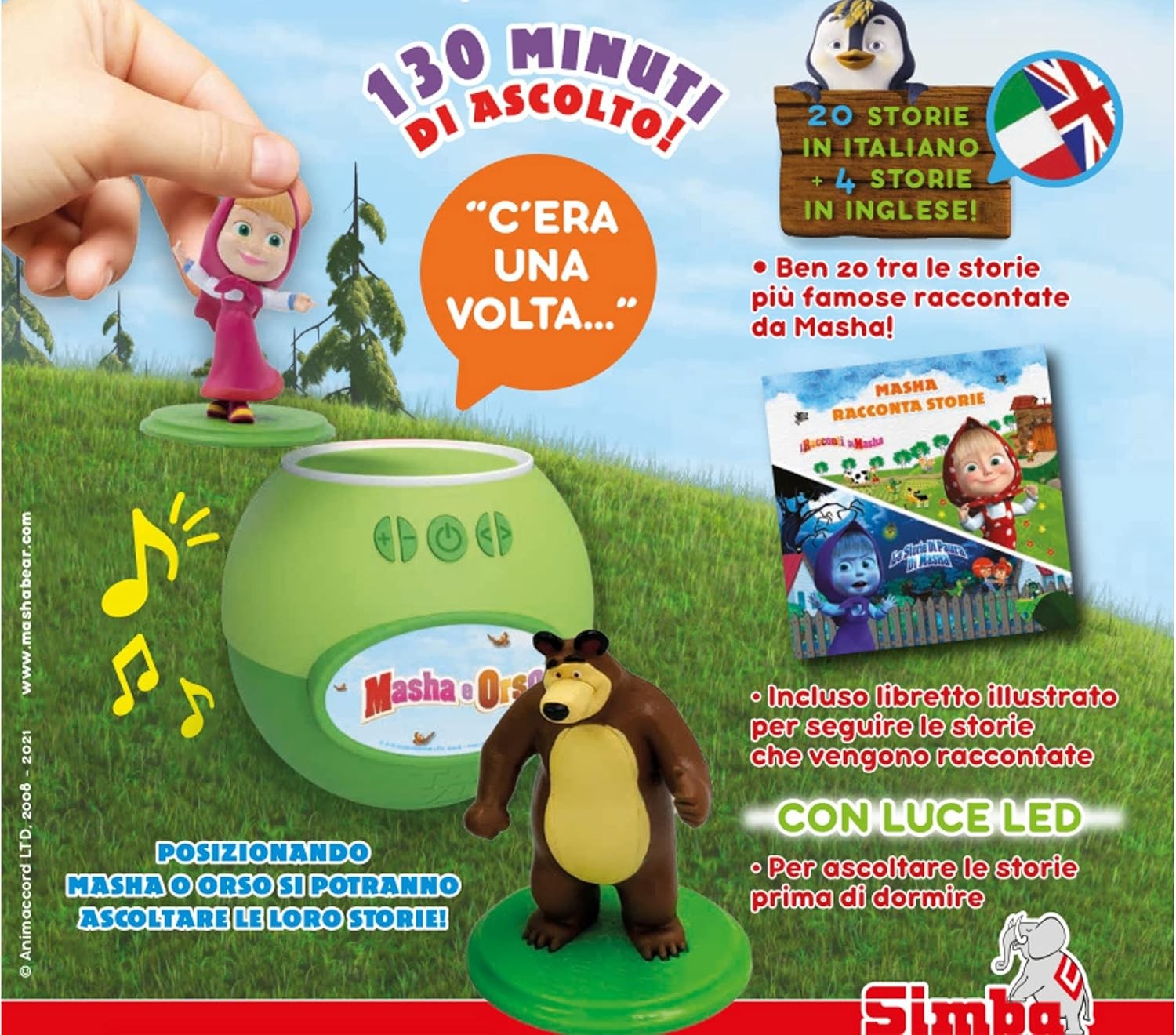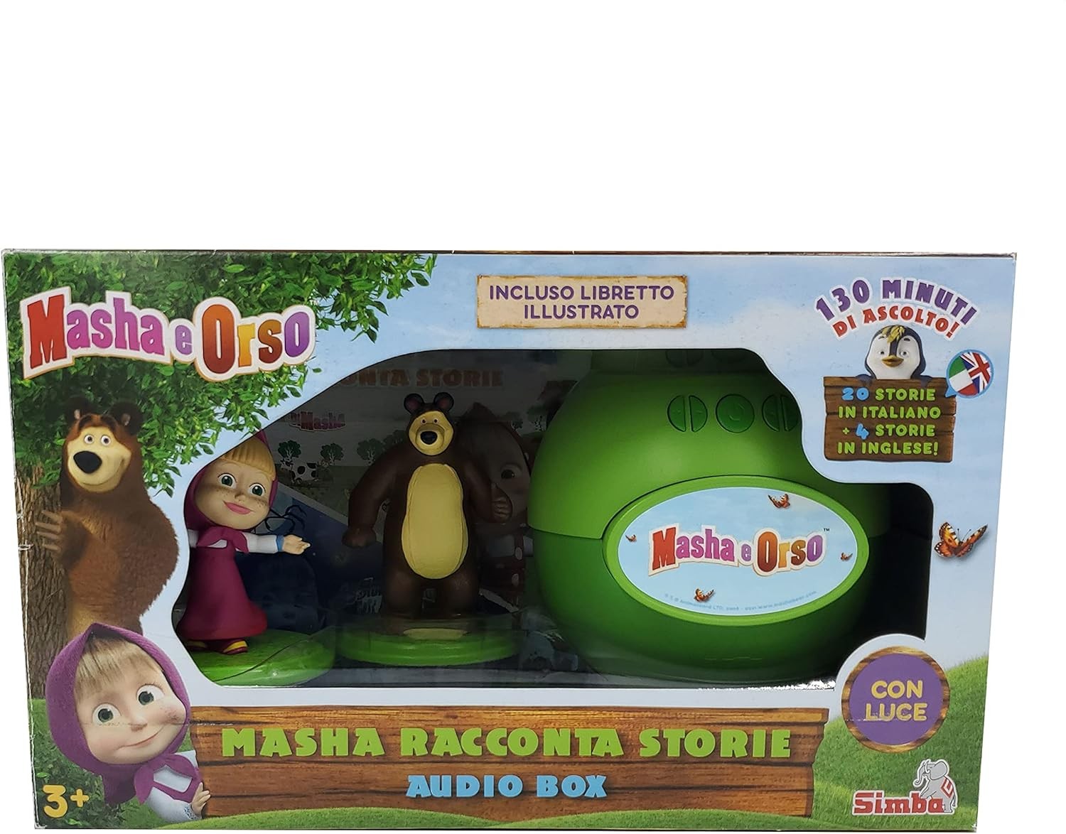 Divertiti con Masha e Orso Racconta Storie: ascolta tante bellissime storie raccontate dalla voce di Masha. Appoggia Masha o Orso sullo speaker per ascoltare tanti racconti! Include 20 storie in italiano tratte dai I racconti di Masha e da Le storie di paura di Masha e 4 in inglese. Per seguire le storie, nella confezione è incluso un libretto illustrato. Il Racconta Storie di Masha è dotato di luce per ascoltare le storie preferite anche prima della nanna. Dotato di cavo di ricarica USB. Adatto a partire dai 3 anni.