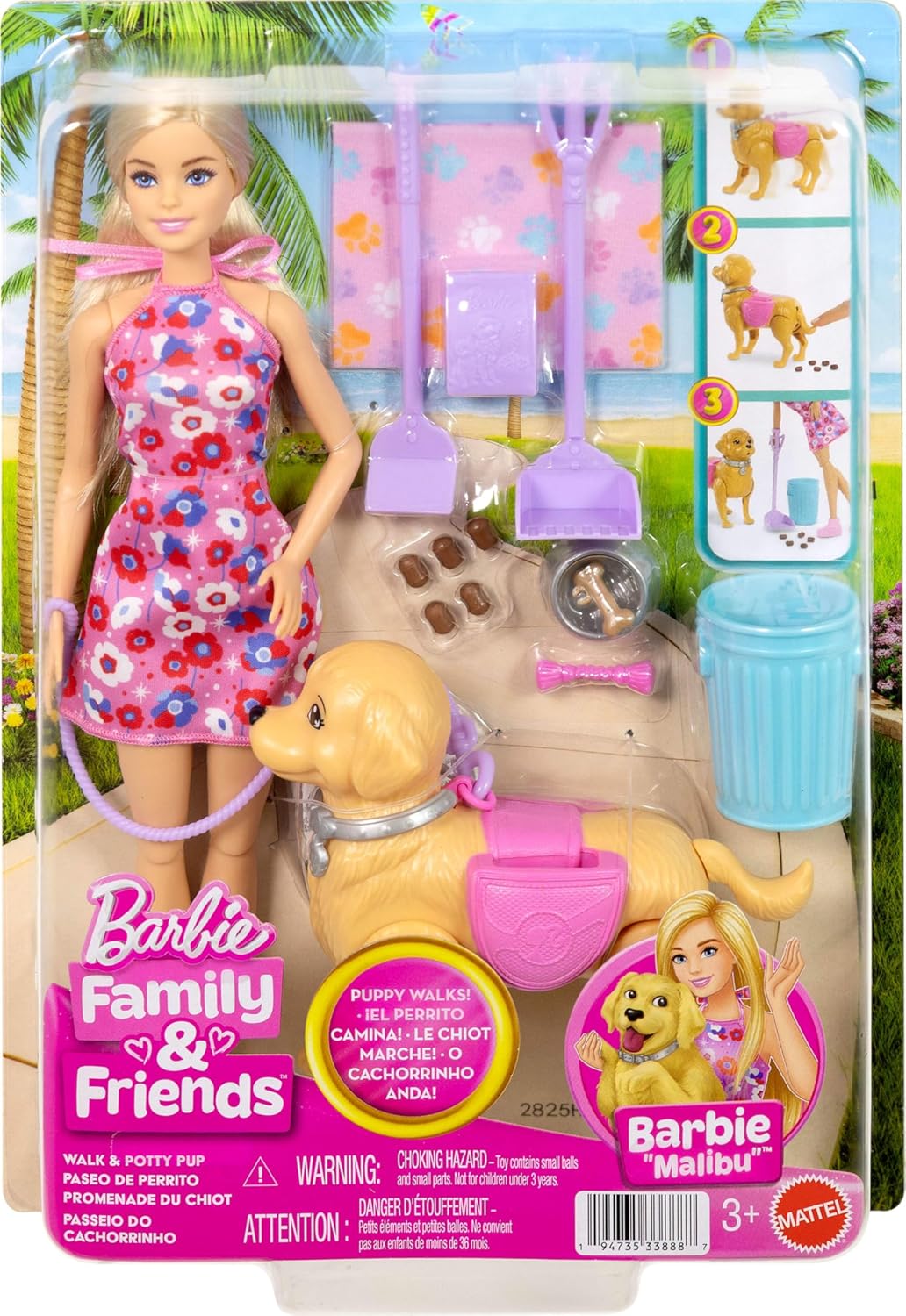Barbie è pronta per una divertente passeggiata con il suo cucciolo che cammina e fa la pupù! Ruota la manopola sul lato del cucciolo, quindi tira il guinzaglio per vederlo camminare. Tocca la coda del cucciolo quando è il momento di fare i bisognini! Pulisci tutto utilizzando il cestino e la paletta per i bisognini che si adatta perfettamente alle mani della bambola. Include anche accessori come una ciotola per il cibo, cibo per cani, un giocattolo e un premio per passare del tempo con il cucciolo. La bambola Barbie indossa un vestito floreale e scarpe da ginnastica perfette per le passeggiate sotto il sole con il suo cucciolo. I bambini e le bambine dai 3 anni in su possono vivere divertenti avventure portando a spasso i loro amici cuccioli!