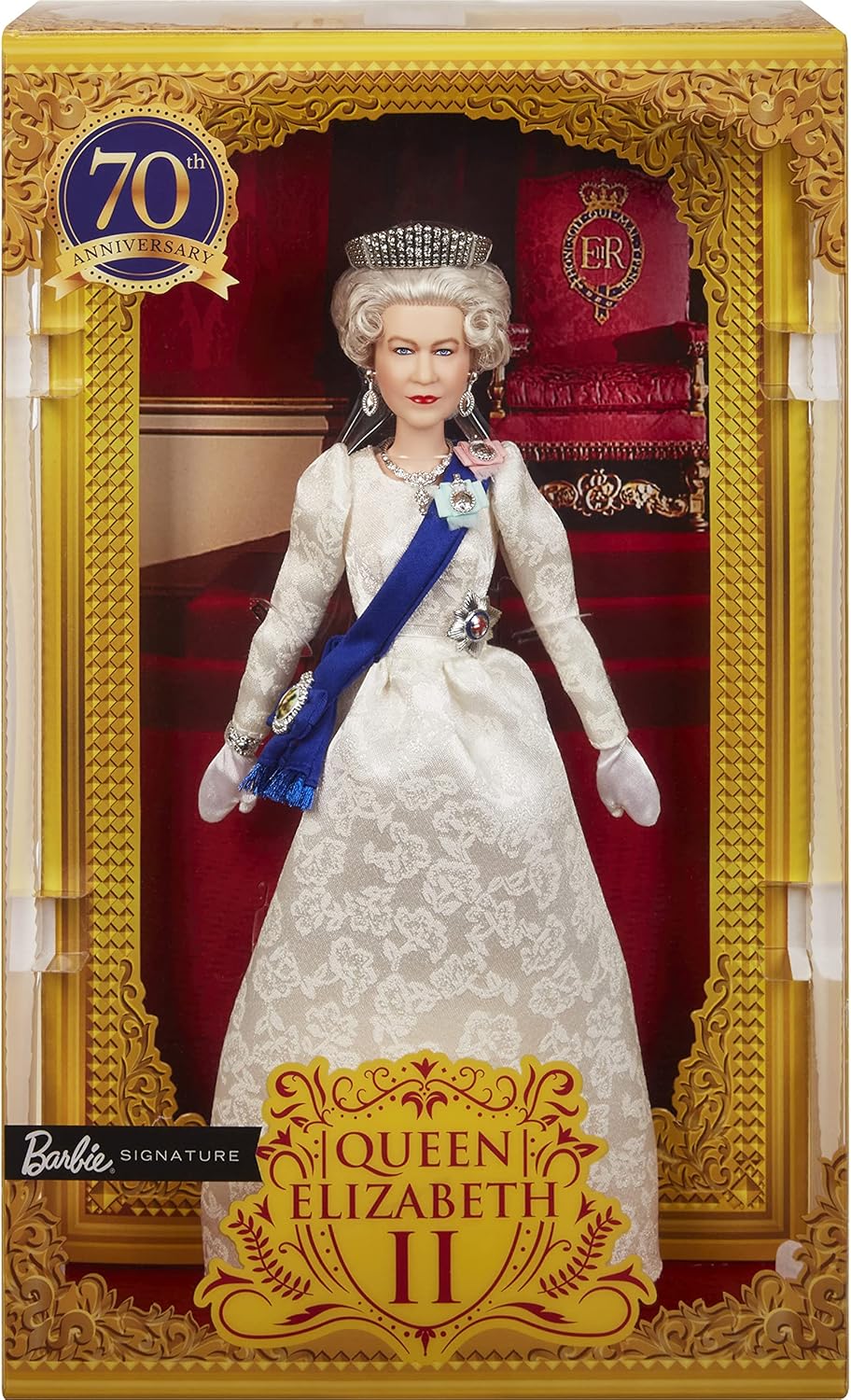 Barbie celebra la più longeva monarca della storia britannica: sua Maestà la Regina Elisabetta II, che governa il suo straordinario regno con incommensurabile senso del dovere e totale dedizione al suo popolo. Con i suoi 70 anni da regnante, la Regina Elisabetta II sarà la prima monarca britannica a celebrare un Giubileo di platino. Ispirata a uno dei look più iconici della regina, questa Barbie da collezione sfoggia un elegante abito color avorio e una fascia blu adornata da riconoscimenti. Una bella corona e accessori coordinati completano il suo ensemble regale. Con una confezione ottima per l’esposizione, la bambola Barbie Regina Elisabetta II è il regalo buono per i collezionisti. La bambola non può reggersi in piedi da sola.