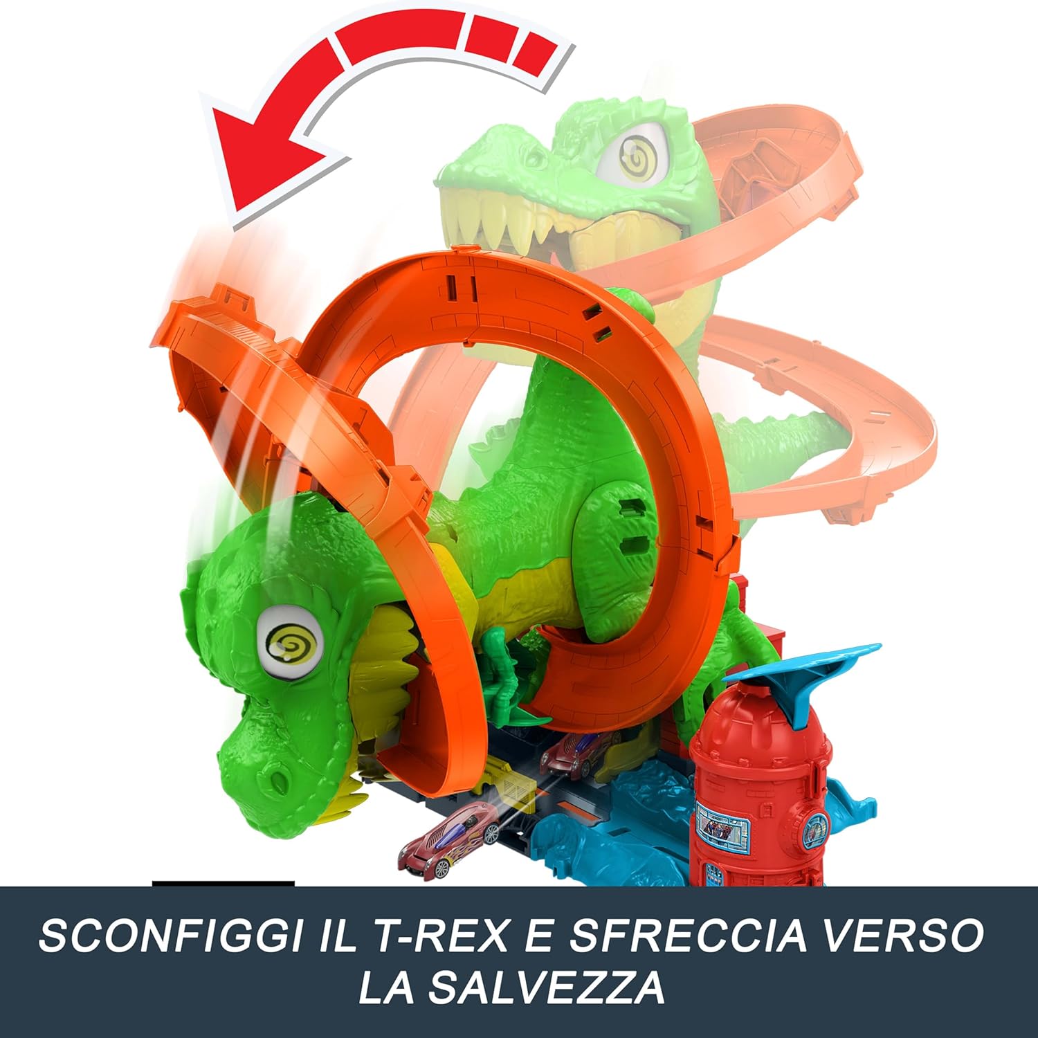 Sfida un T-Rex affamato che ha attaccato la stazione dei pompieri di Hot Wheels City con un camion giocattolo in scala 1:64! Il playset include un grande dinosauro con occhi che ruotano ogni volta che le macchinine gli passano davanti, fino a quando non viene sconfitto! Lancia le macchinine al massimo della velocità da far ruotare gli occhi e colpisci i denti del dinosauro per poi essere mangiato ed espulso! Inserisci di nuovo la macchinina e ricomincia, ma questa volta fai una sosta alla stazione di rifornimento. È il momento di ricaricarsi prima della prossima corsa! Non arrenderti ora! Dopo aver fatto il rifornimento di carburante, fai sfrecciare di nuovo il veicolo e metti il dinosauro K.O., salvando gli amici e Hot Wheels City. Mentre affrontano il nemico, i bambini imparano l’importanza della persistenza e della determinazione. I bambini dai 4 anni in su adoreranno prendere parte alla sfida per sconfiggere il dinosauro con i loro veicoli Hot Wheels!