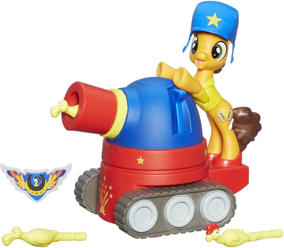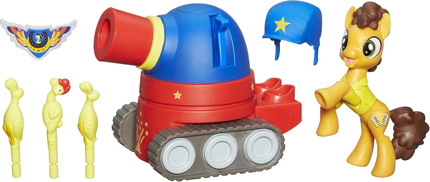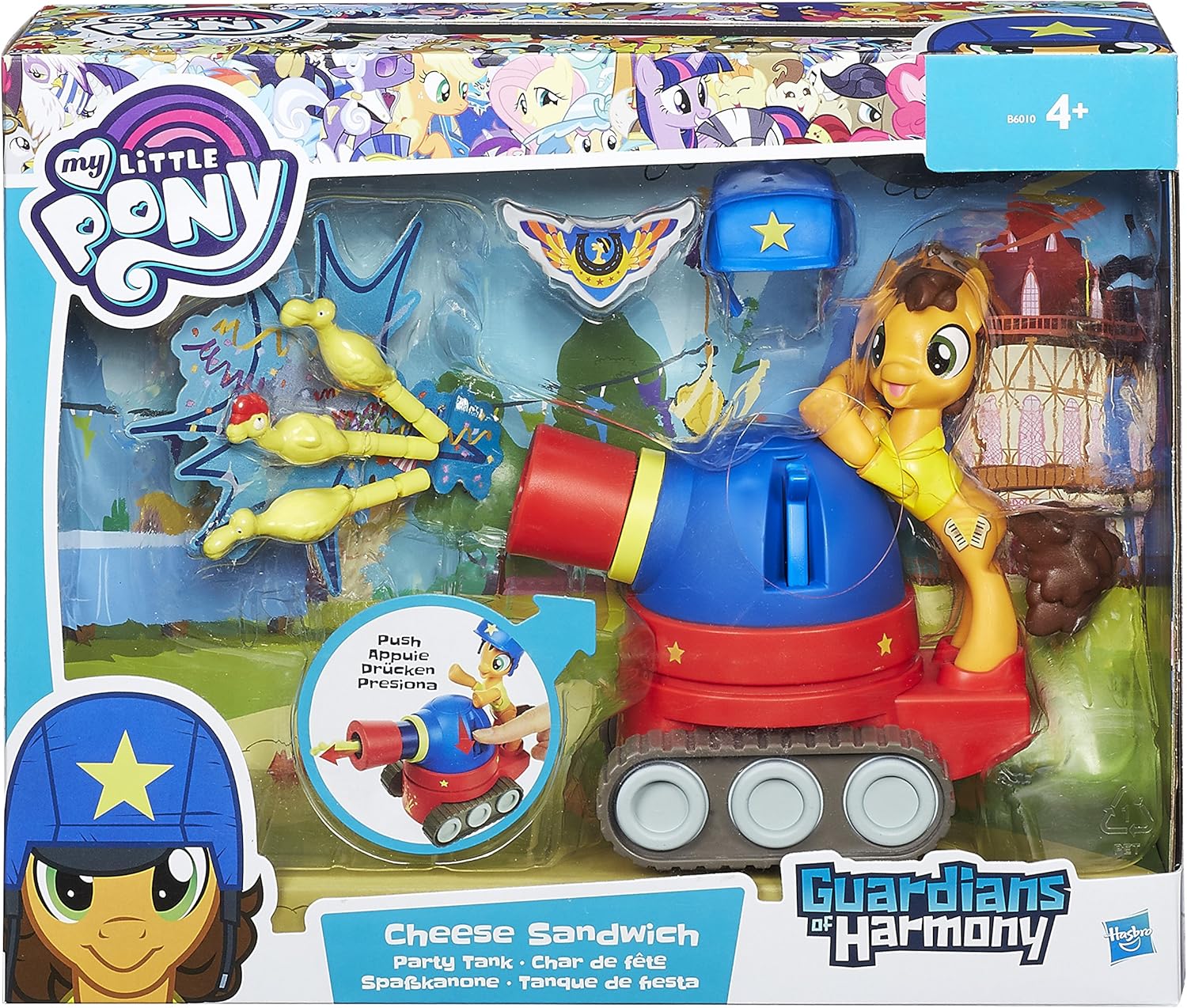 I Guardiani dell’Armonia sono pony avventurosi, che se le inventano tutte pur di farti divertire! Questa volta Cheese Sandwich guida addirittura un buffo carro armato da circo, con tanto di cingoli, che lancia in volo un pollo e un pellicano da gara! Cheese Sandwich è alto 8 cm ed è completamente snodato! Indossa il distintivo dei Guardiani in dotazione e preparati al prossimo lancio a razzo!