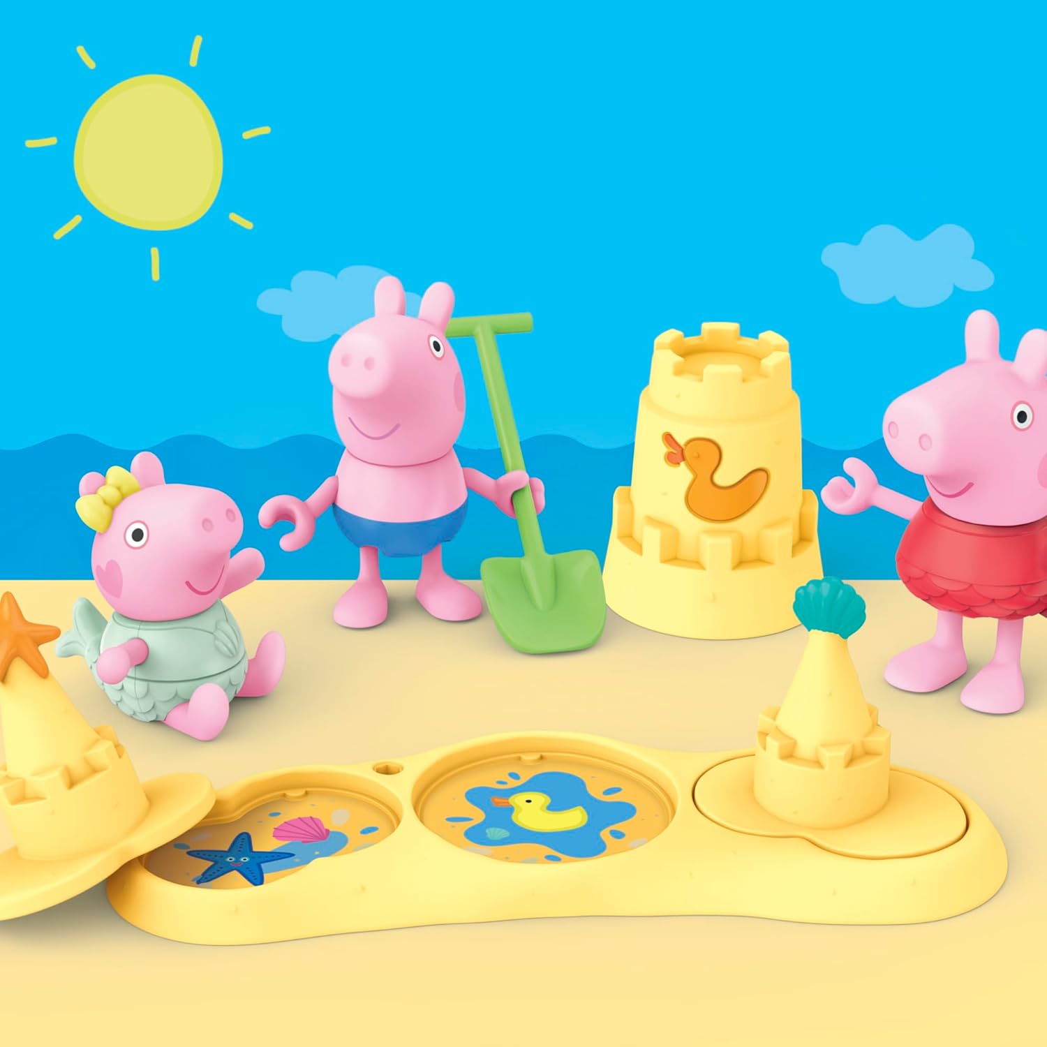 • 3 ACTION FIGURE IN COSTUME DA BAGNO: Peppa, George e Evie indossano adorabili costumi da bagno per la loro giornata in spiaggia! Evie ha anche una piccola coda da sirena