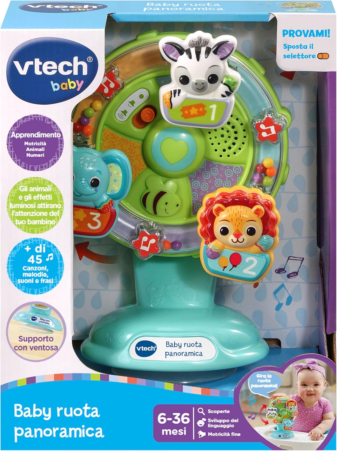 Una ruota panoramica interattiva per fare il pieno di scoperte a ritmo di musica e suoni divertenti! Girando la Baby ruota panoramica, questa riproduce delle orecchiabili melodie e canzoni e dei suoni divertenti. 3 pulsanti animaletto accompagnano il tuo bambino nella scoperta dei numeri, dei colori, degli animali e degli oggetti. Delle stelle colorate si illuminano al ritmo dei suoni e delle melodie, stimolando il senso visivo del tuo piccolo. Il sensore di movimento integrato riproduce die suoni ogni volta che si fa girare la ruota. Divertente e sicura! Grazie al supporto con ventosa, la Baby ruota panoramica può essere attaccata in tutta sicurezza sul piano del seggiolone e su qualsiasi superficie liscia.