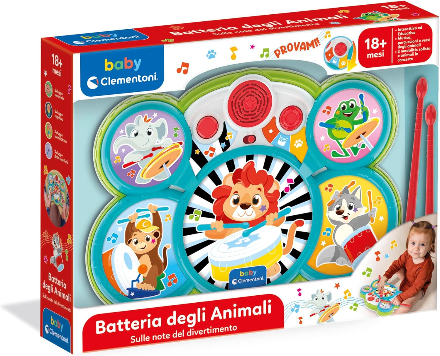 Una divertente batteria elettronica colorata per iniziare a suonare insieme ai simpatici animali, dotata di 5 aree interattive e suoni realistici per scoprire il ritmo e la musica in modo coinvolgente e divertente. Attraverso i suoni realistici delle percussioni e i simpatici versi degli animali il gioco stimola lo sviluppo cognitivo, favorisce la coordinazione la creatività musicale dei più piccoli. Il bambino può suonare con le mani o con le due bacchette incluse scegliendo tra 10 basi musicali e 5 diversi stili di percussione, oppure divertirsi a scoprire i versi degli animali interagendo con le modalità solista o animali in concerto. Gioco ideato progettato e sviluppato in Italia, per bambini dai 18 mesi in su; include una batteria, 2 bacchette e pratico alloggiamento integrato, include 2 batterie 1,5V AAA a scopo dimostrativo.