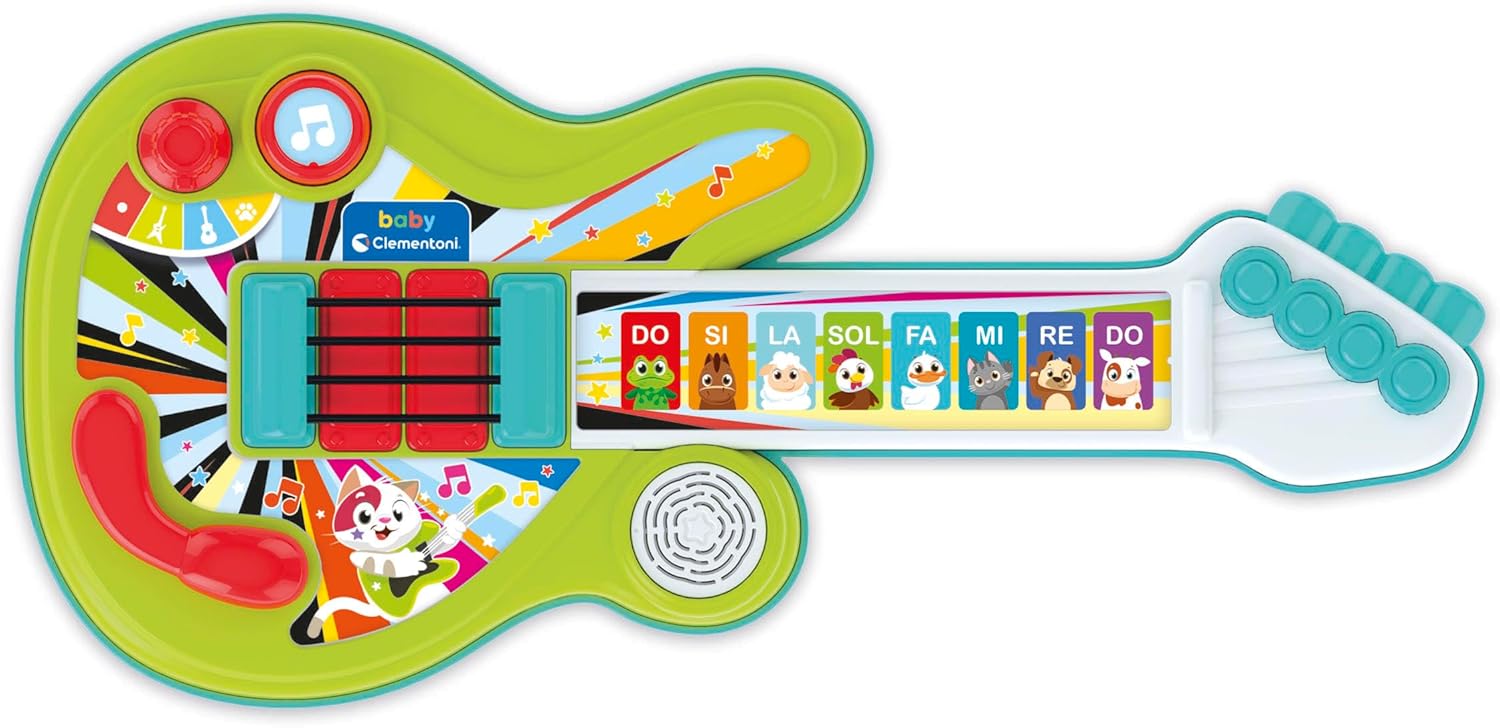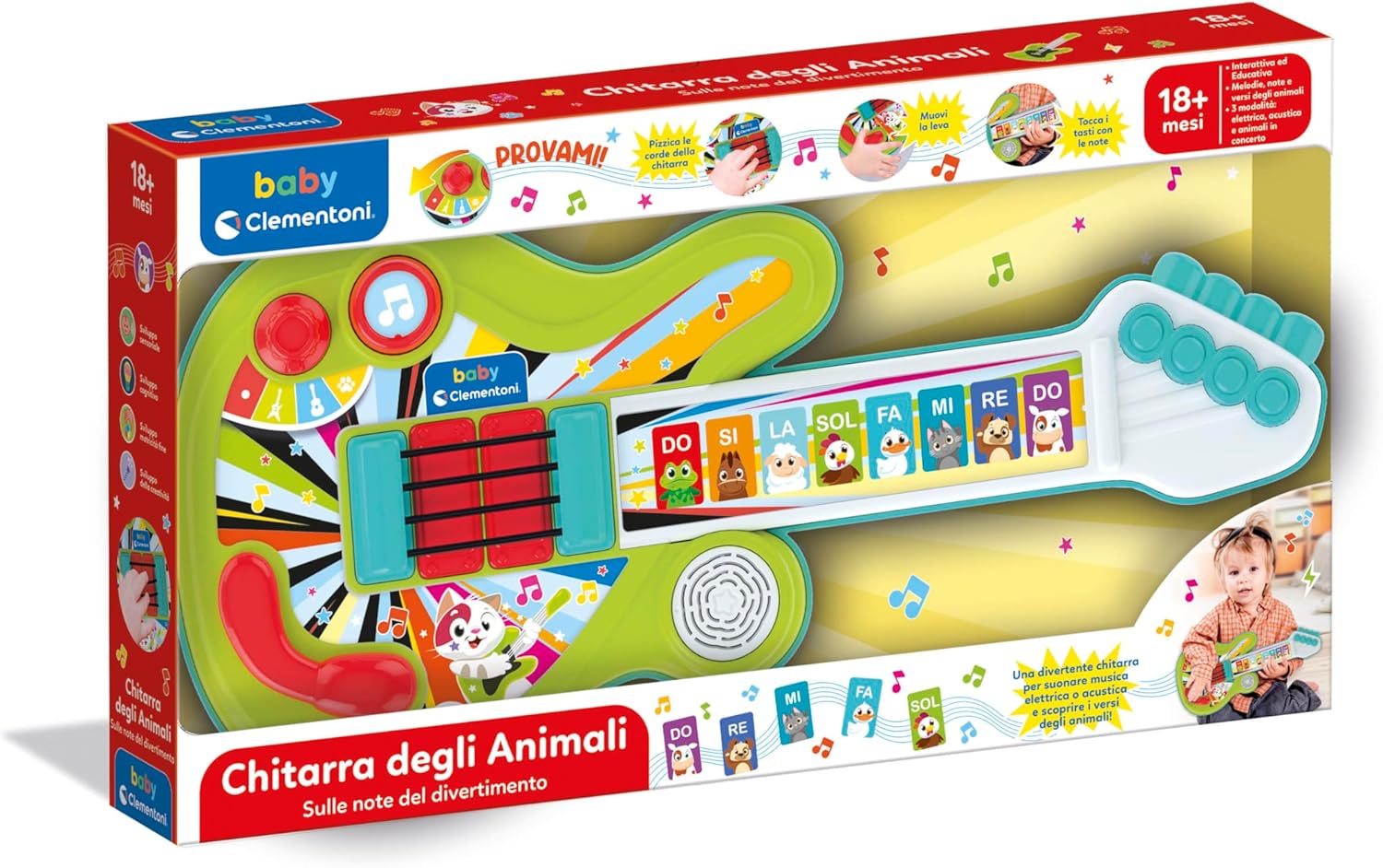Una divertente chitarra interattiva per iniziare a suonare e scoprire le note e i versi degli animali grazie a 8 tasti colorati, corde e una leva del vibrato per scoprire il ritmo e la musica in modo coinvolgente e divertente. Attraverso i suoni realistici della chitarra e i simpatici versi degli animali il gioco stimola lo sviluppo cognitivo, favorisce la coordinazione la creatività musicale dei più piccoli. Il bambino può scegliere tra 3 modalità di gioco come chitarra elettrica, acustica o versi degli animali, suonando su 15 basi musicali, 8 accordi e canzoni diverse pizzicando le corde o usando la tastiera interattiva. Gioco ideato progettato e sviluppato in Italia, per bambini dai 18 mesi in su; include una chitarra interattiva leggera e maneggevole con 2 batterie da 1,5V AAA incluse nella confezione a scopo dimostrativo.