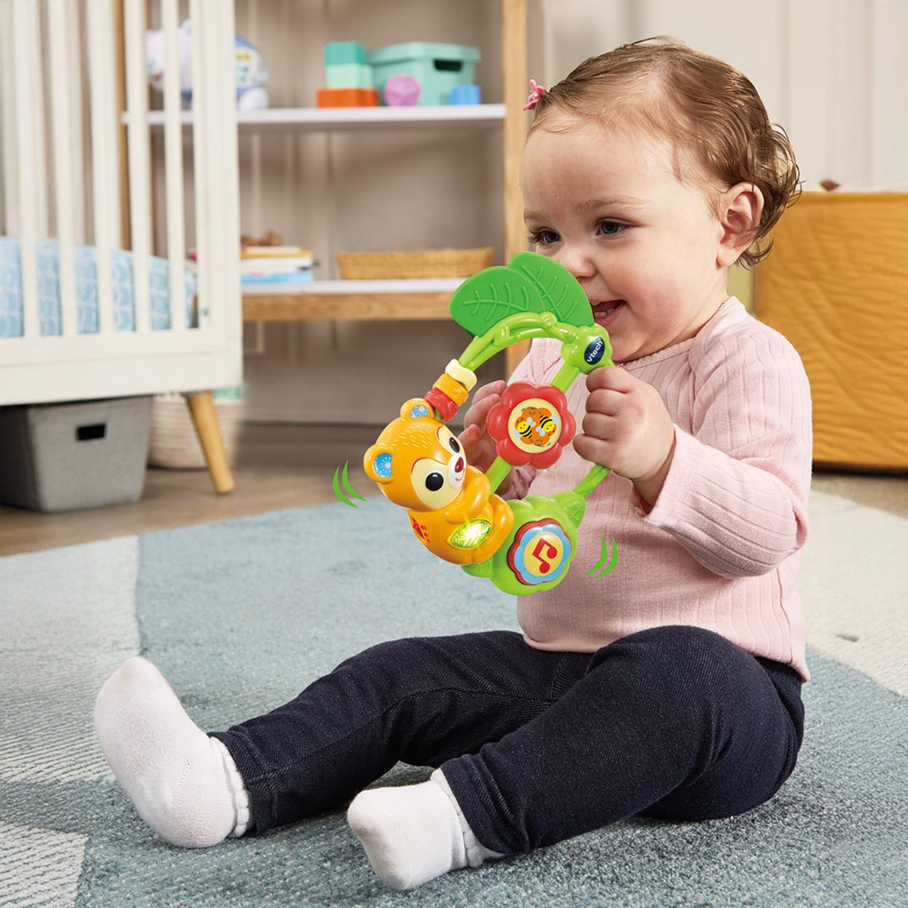 • Grazie al sensore di movimento nel fiorellino, il giocattolo si attiva con suoni divertenti che incoraggiano il bambino a muoversi e interagire.