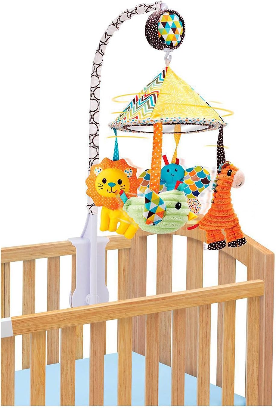 Carosello mobile giostra musicale Infantino Go Gaga. Questo bellissimo giostra musicale permette di calmare il bambino prima che si addormenta grazie alla sua musica dolce (3 minuti). Il bambino si meraviglierà dal grande specchio (diametro 14 cm) e dai 4 adorabili personaggi (leone, farfalla, giraffa, uccello) che ruotano lentamente. Il carillon con meccanismo a carica (senza batteria) è rivestito in un tessuto molto bello, è rimovibile per essere portato ovunque. Questo mobile musicale in tessuto colorato, coordinato con il tappeto Tipi (Rif 005345), aggiungerà il tocco finale alla decorazione della cameretta del bambino. Questo mobile si attacca alla maggior parte dei lettini per bambini.