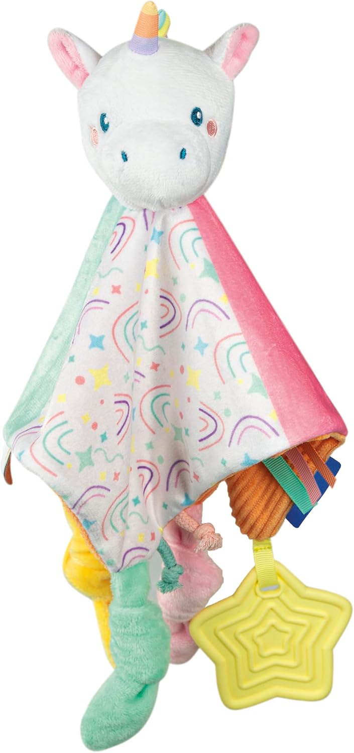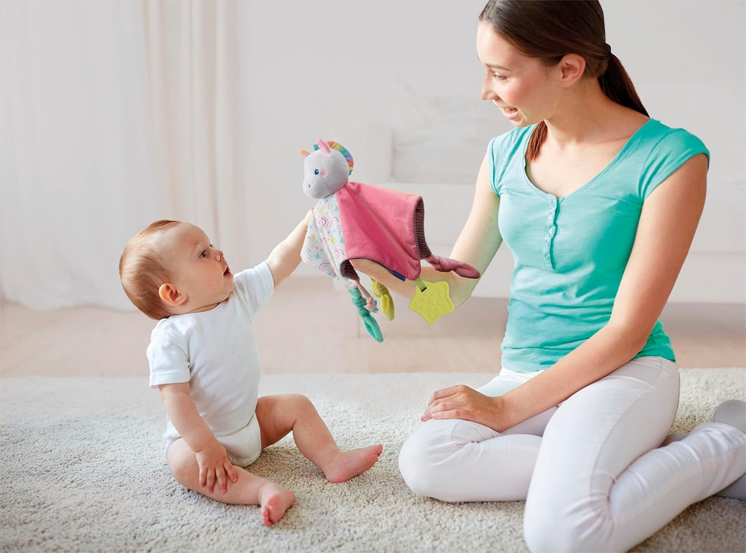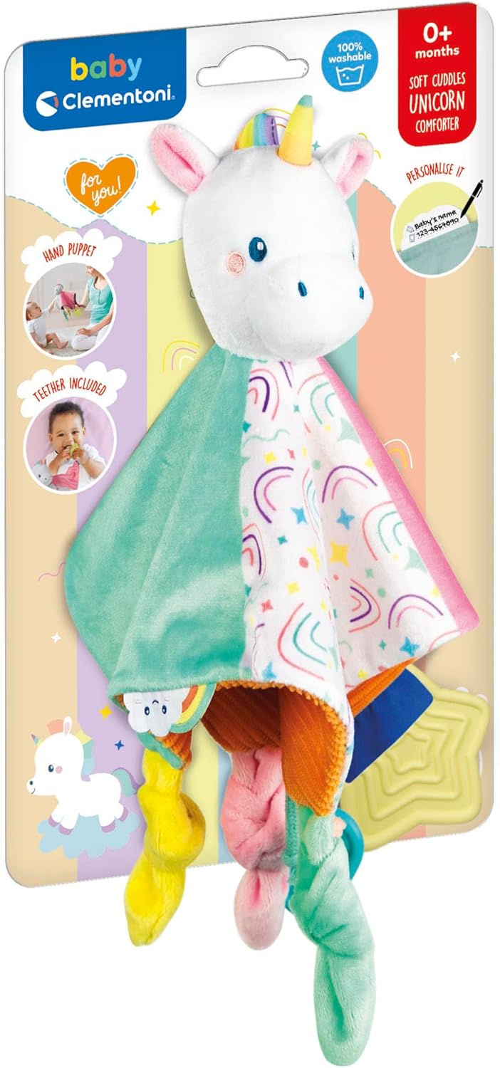 - COSA CONTIENE: gioco ideato per neonati, dotato di un comforter a forma di unicorno realizzato in morbido tessuto lavabile e di un dentaruolo mordicchioso