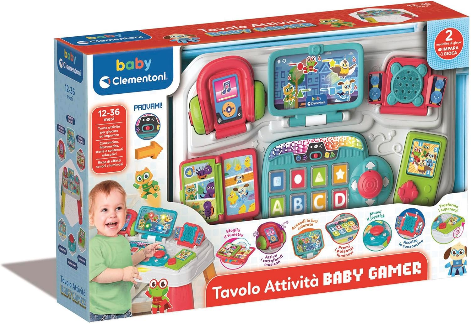 - TAVOLO ATTIVITA’ BABY GAMER: una postazione gaming per giocare come i grandi, con elementi interattivi, canzoni, storie e elementi luminosi, con due modalità Impara e Gioca