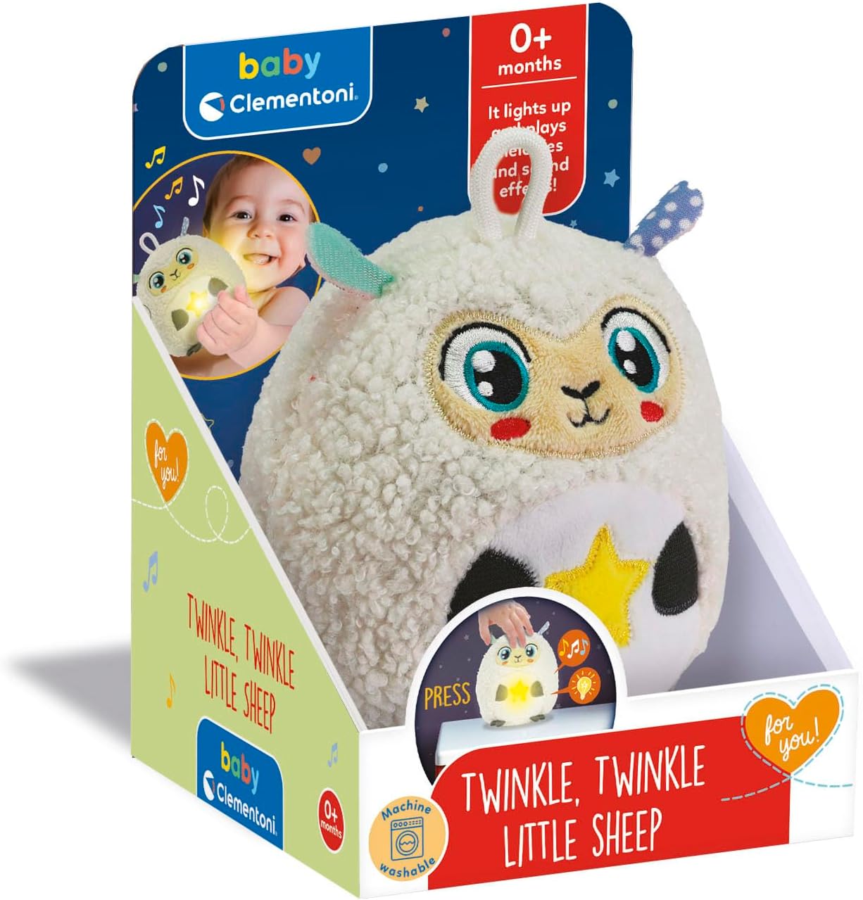 Una dolce pecorella che fa da lampada notturna per neonati e crea un ambiente rilassante intorno al bambino, con luci soffuse e melodie calmanti per favorire il sonno sereno; ideale per i momenti pre-nanna e durante la notte. Luci e suoni sono pensati per diventare parte del rituale della buonanotte; la musica classica e i suoni white noise aiutano a calmare il bambino, riducendo la sovrastimolazione e creando un ambiente accogliente e tranquillo. Il peluche è dotato di una luce notturna calda e 10 minuti di melodie rilassanti e suoni bianchi per rilassare il bambino e accompagnarlo nella nanna. Gioco ideato, progettato e sviluppato in Italia per i più piccoli, con luce soffusa e suoni rilassanti, 100% lavabile in lavatrice rimuovendo il modulo elettronico all’interno.