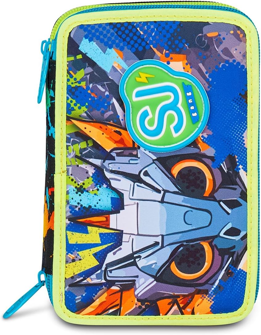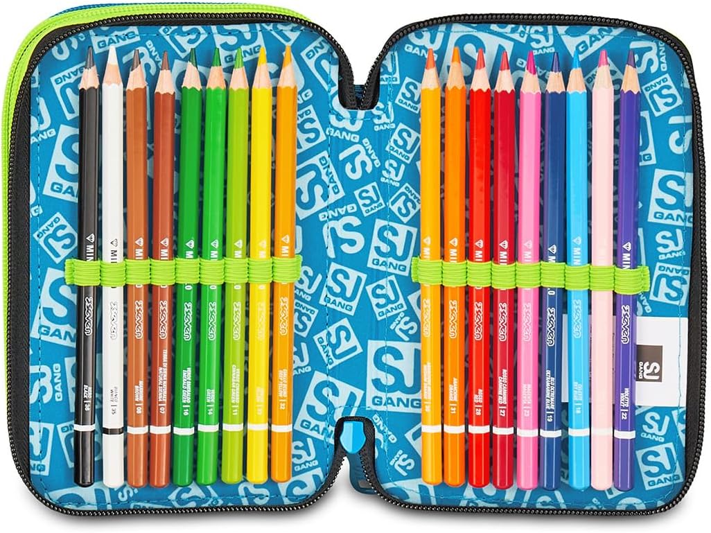 Ciao! Sono il coloratissimo Astuccio 3 zip SJ Gang. Dotato di 3 scomparti completi di tutto il materiale necessario per fare al meglio i tuoi lavori di scuola, puoi abbinarmi a uno zaino o a un trolley SJ Gang.