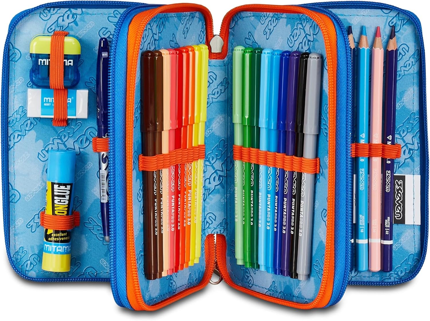 Dimensioni 12,5 x 20 x 7 cm. CONTENUTO 45 PEZZI: 1 penna cancellabile blu Frixion, 1 penna sfera rossa, 18 pastelli a colore MINAPRO 4.0, 18 pennarelli PUNTAPRO 3.0, 1 matita grafi te esagonale HB, 1 colla gialla azzurra, 1 gomma bianca con cartoncino stampato, 1 temperino barilotto 2 fori, 1 righello trasparente, 1 matita bicolor rosso/blu, 1 paio di forbici in metallo. Tasche triplo scomparto. Tessuto poliestere.