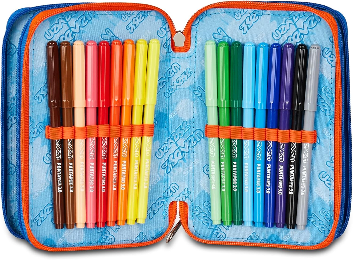 Questo astuccio Seven 3 zip ha tre scomparti in cui troverai tutto il materiale necessario per la tua giornata di scuola. A te non resta altro che abbinarlo a uno zaino o trolley Seven.