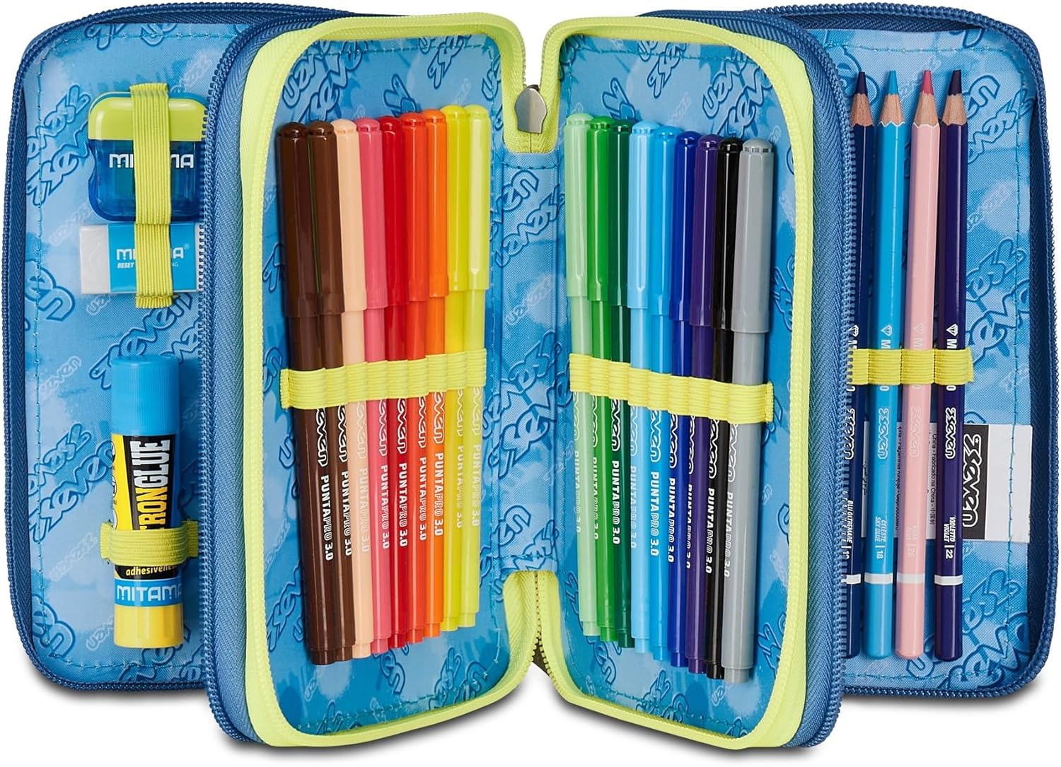Questo astuccio Seven 3 zip ha tre scomparti in cui troverai tutto il materiale necessario per la tua giornata di scuola. A te non resta altro che abbinarlo a uno zaino o trolley Seven.