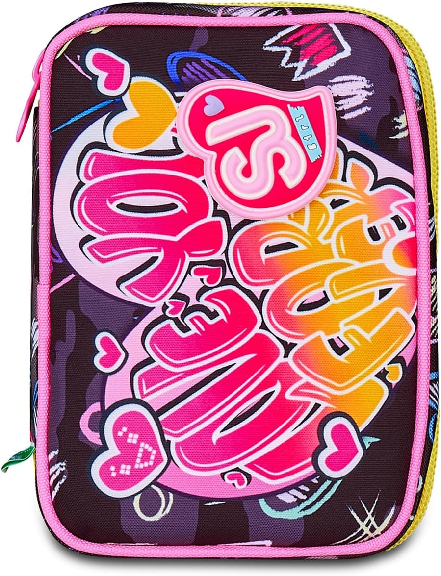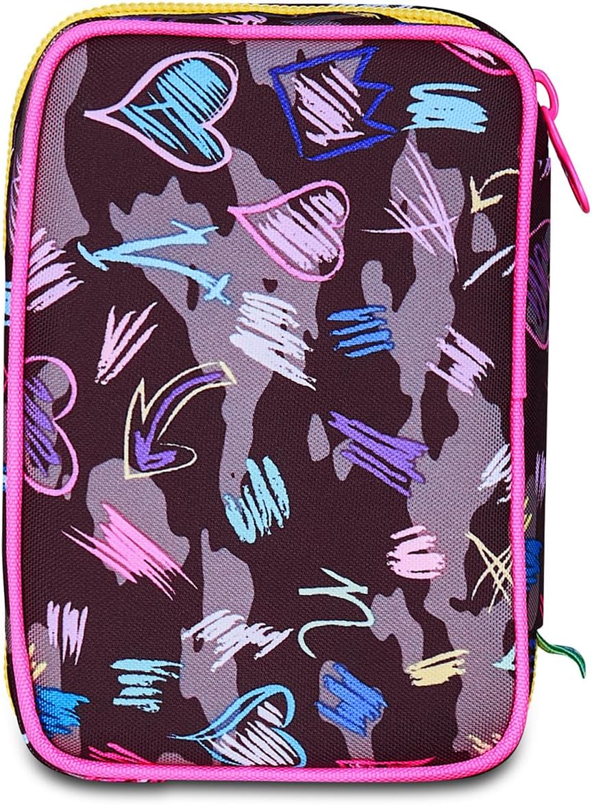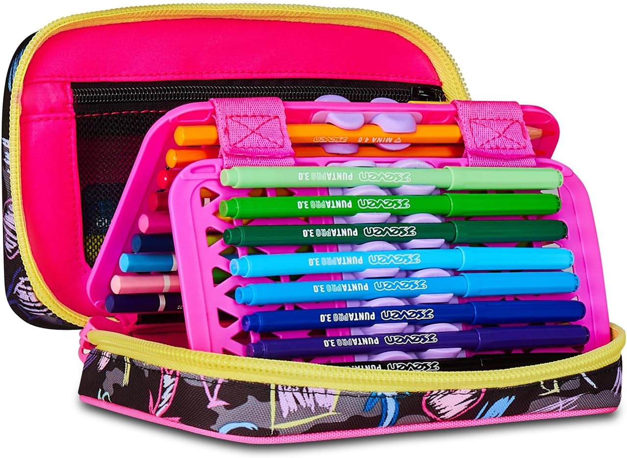 Dimensioni 14,3 x 20,5 x 7 cm. Apertura singola tramite maxi zip, plance interne amovibili e agganci flessibili in gomma per cancelleria. CONTENUTO 45 PEZZI: 1 Penna cancellabile blu, 1 Penna a sfera rossa, 18 Pastelli a colore 4.0 esagonali, 18 Pennarelli superlavabili punta 3.0 mm, 1 Matita grafite esagonale HB Mitama, 1 Colla, 1 Gomma, 1 Temperino barilotto 2 fori, 1 Righello, 1 matita bicolor rosso/blu, 1 paio di forbici. Tasca interna per cancelleria. Tessuto poliestere.