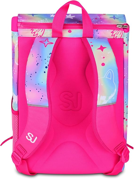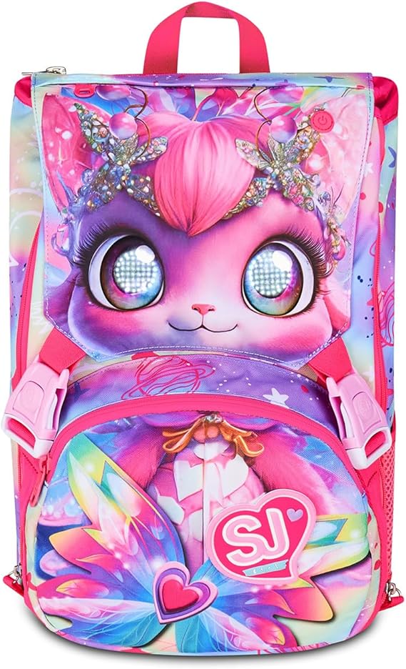 Ciao! Sono CAT LED, lo zaino estensibile SJ GANG con cui vai a scuola, ma puoi anche giocare. Divertiti ad accendere tutte le volte che vuoi gli OCCHI del GATTINO sulla pattina! Tramite pulsante ON/OFF puoi attivare il dispositivo luminoso con effetto LIGHTING MOVING EYES. Il dispositivo è ricaricabile tramite USB ed è inserito in un pattina staccabile, così lo zaino rimane lavabile. Ho un doppio scomparto spazioso, di cui puoi aumentare facilmente la capienza tramite le zip laterali per poter accogliere e distribuire in modo ottimale libri, quaderni e tutto ciò che ti serve per la tua giornata, potendo sfruttare anche la tasca frontale e la tasca porta borraccia. Inoltre, sono davvero comodo da indossare sulle spalle, grazie a schienale e spallacci confortevoli. In più, il fondo integrato mantiene la mia struttura inalterata, garantendo la stabilità del contenuto anche a pieno carico.